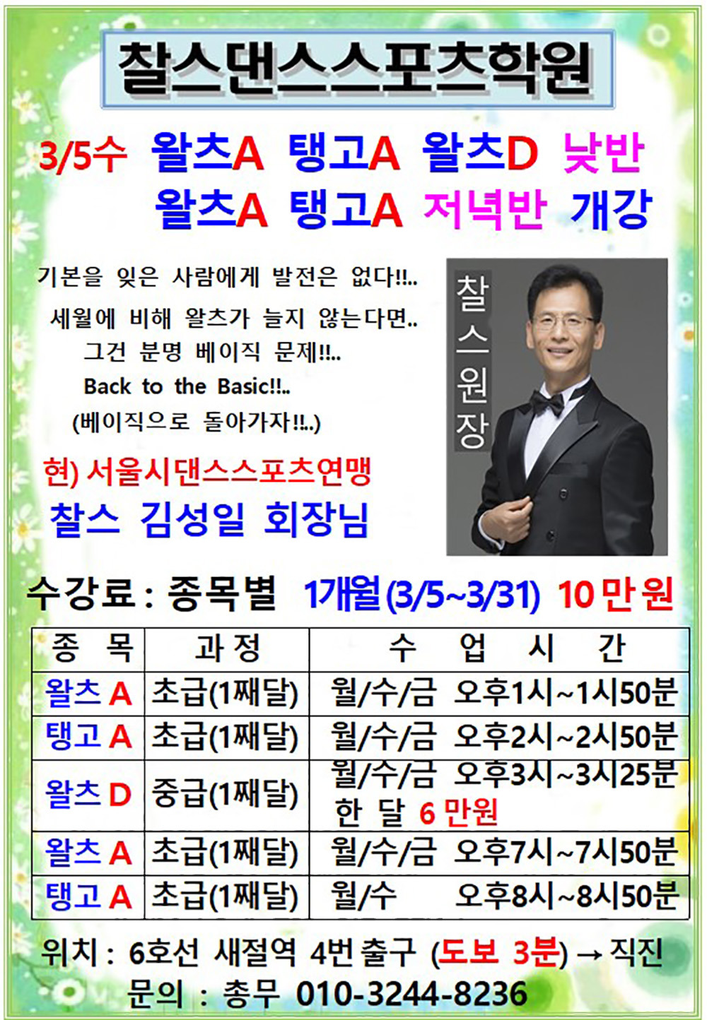 찰스댄스스포츠학원 3월5일 왈츠/탱고 기초반 왈츠D 중급반 개강 작성자해맑은미소|작성시간25.02.13|조회수106 목록 댓글 0 글자크기 작게가 글자크기 크게가 다음검색 현재 게시글 추가 기능 열기 북마크 공유하기 신고 센터로 신고 댓글 댓글 0 댓글쓰기 답글쓰기 댓글 리스트
