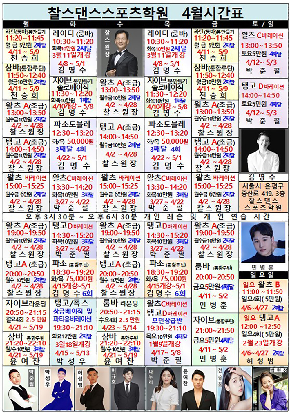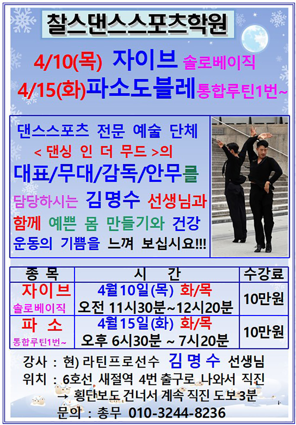 찰스댄스스포츠학원 4월 단체반 시간표 작성자열정의 찰스|작성시간25.03.29|조회수214 목록 댓글 0 글자크기 작게가 글자크기 크게가 다음검색 현재 게시글 추가 기능 열기 북마크 공유하기 신고 센터로 신고 댓글 댓글 0 댓글쓰기 답글쓰기 댓글 리스트