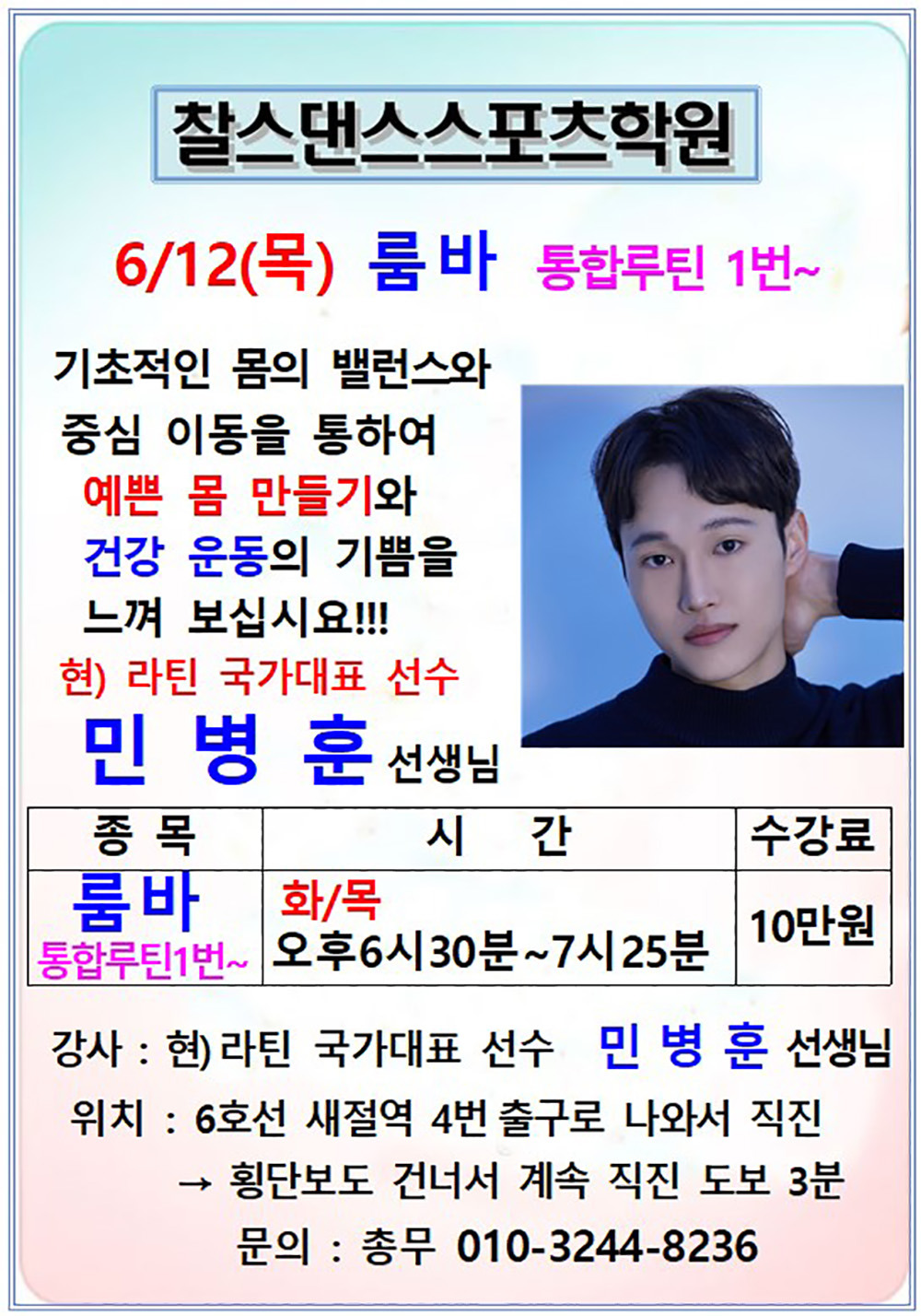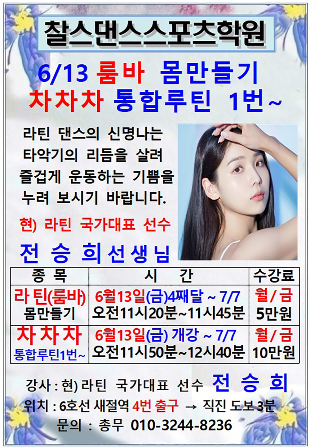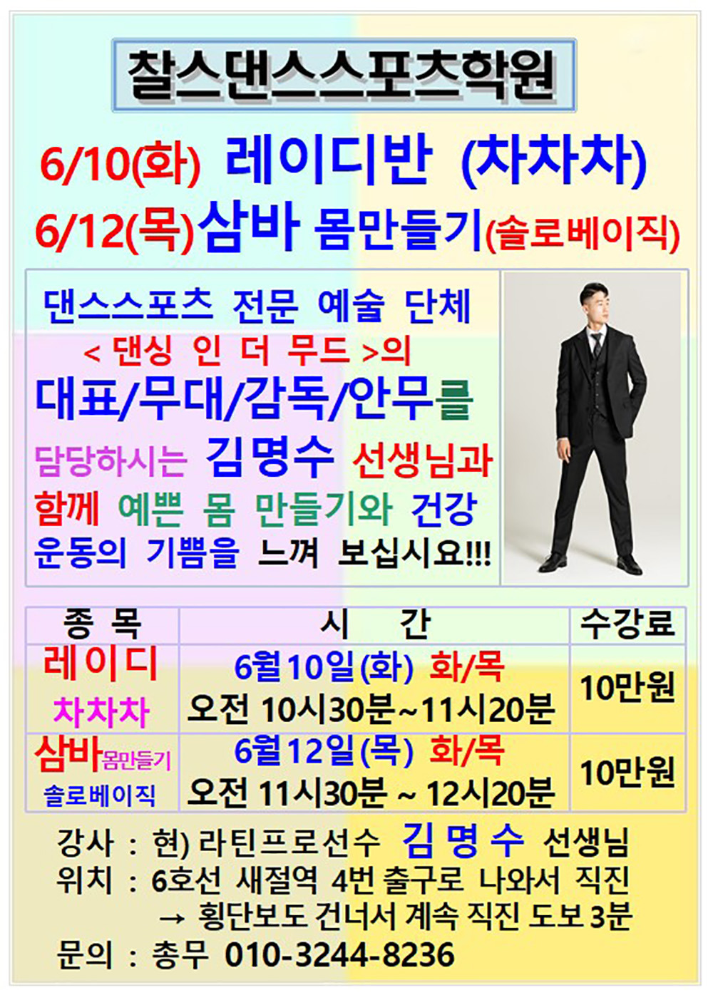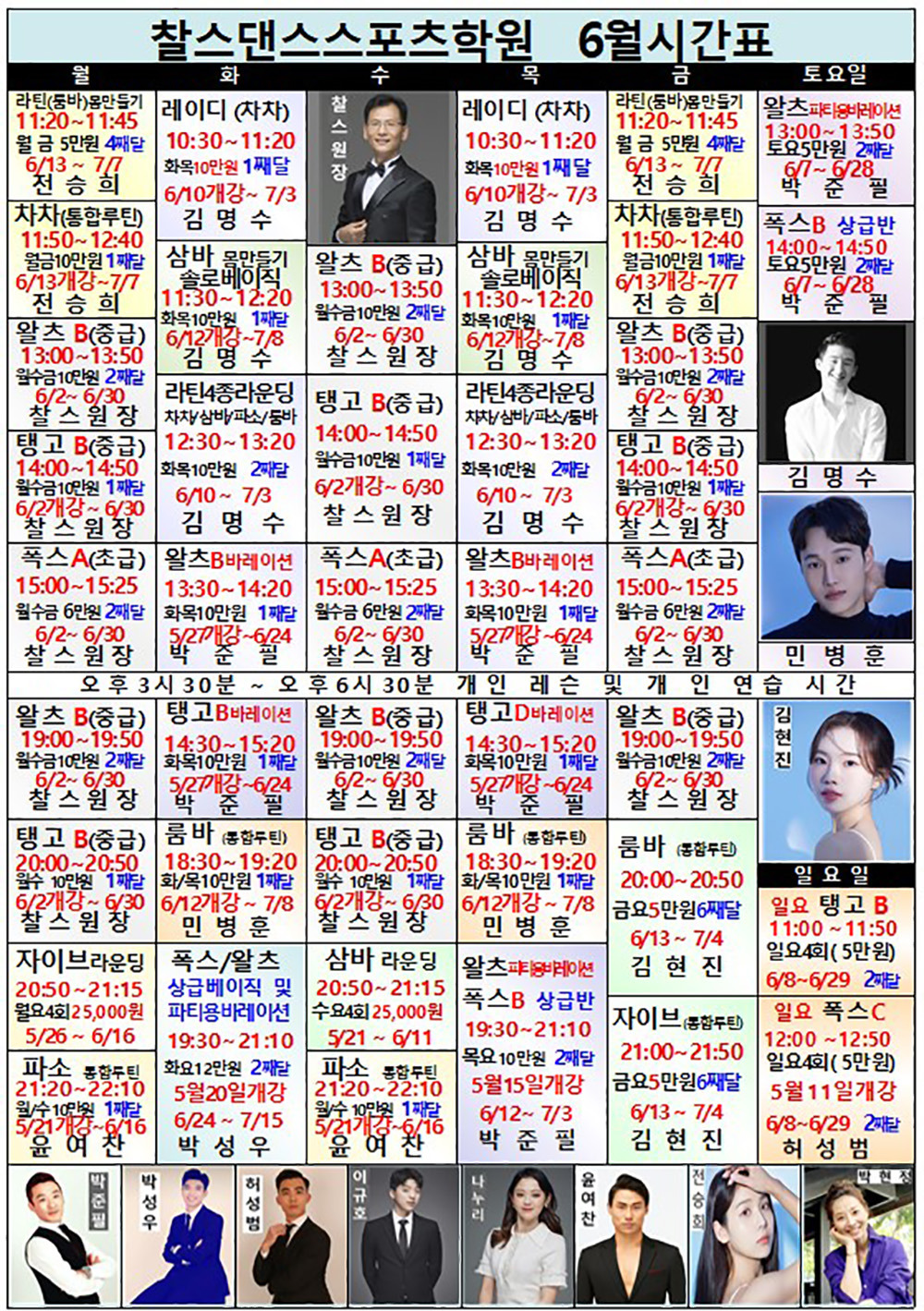 찰스댄스스포츠학원 6월 전체 시간표 작성자해맑은미소|작성시간25.05.25|조회수214 목록 댓글 0 글자크기 작게가 글자크기 크게가 다음검색 현재 게시글 추가 기능 열기 북마크 공유하기 신고 센터로 신고 댓글 댓글 0 댓글쓰기 답글쓰기 댓글 리스트