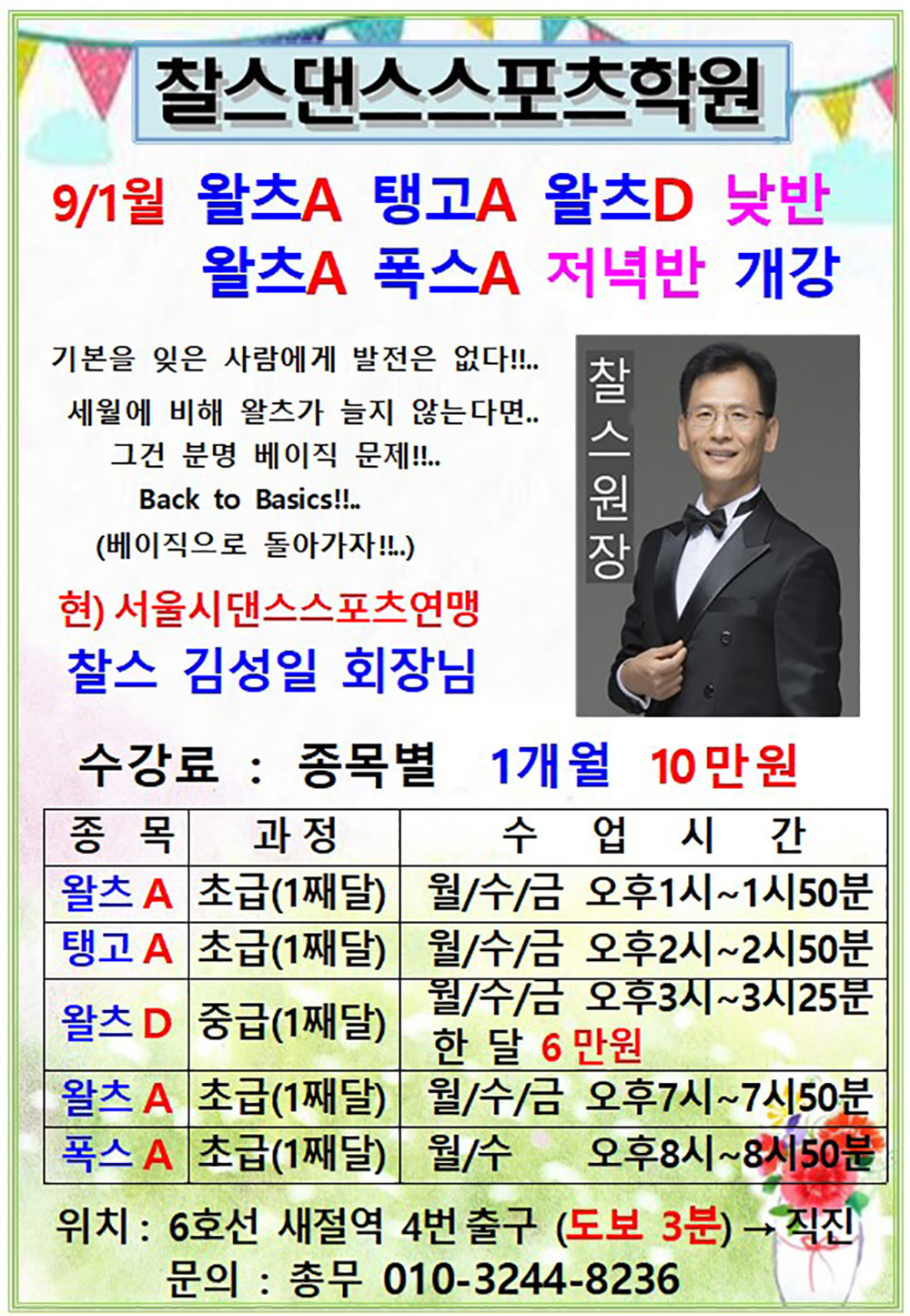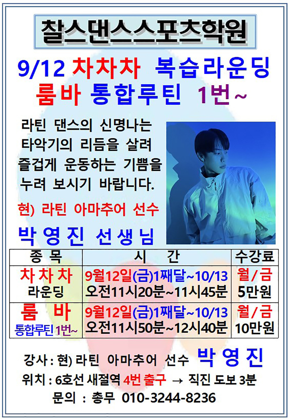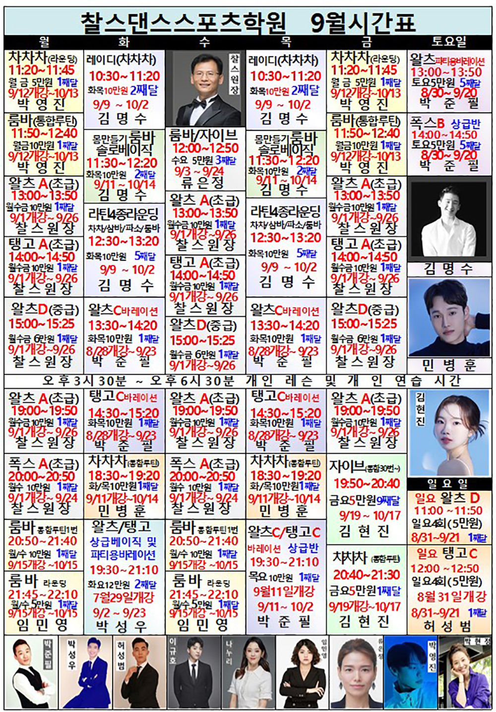 찰스댄스스포츠학원 9월 단체반 전체 시간표 작성자해맑은미소|작성시간25.09.08|조회수180 목록 댓글 0 글자크기 작게가 글자크기 크게가 다음검색 현재 게시글 추가 기능 열기 북마크 공유하기 신고 센터로 신고 댓글 댓글 0 댓글쓰기 답글쓰기 댓글 리스트