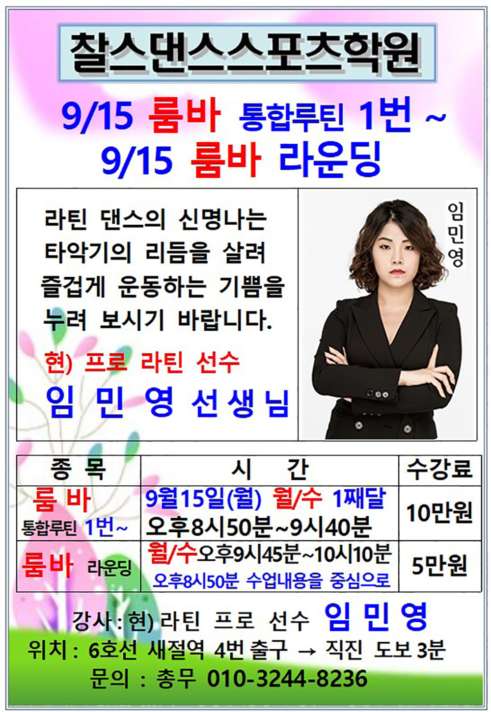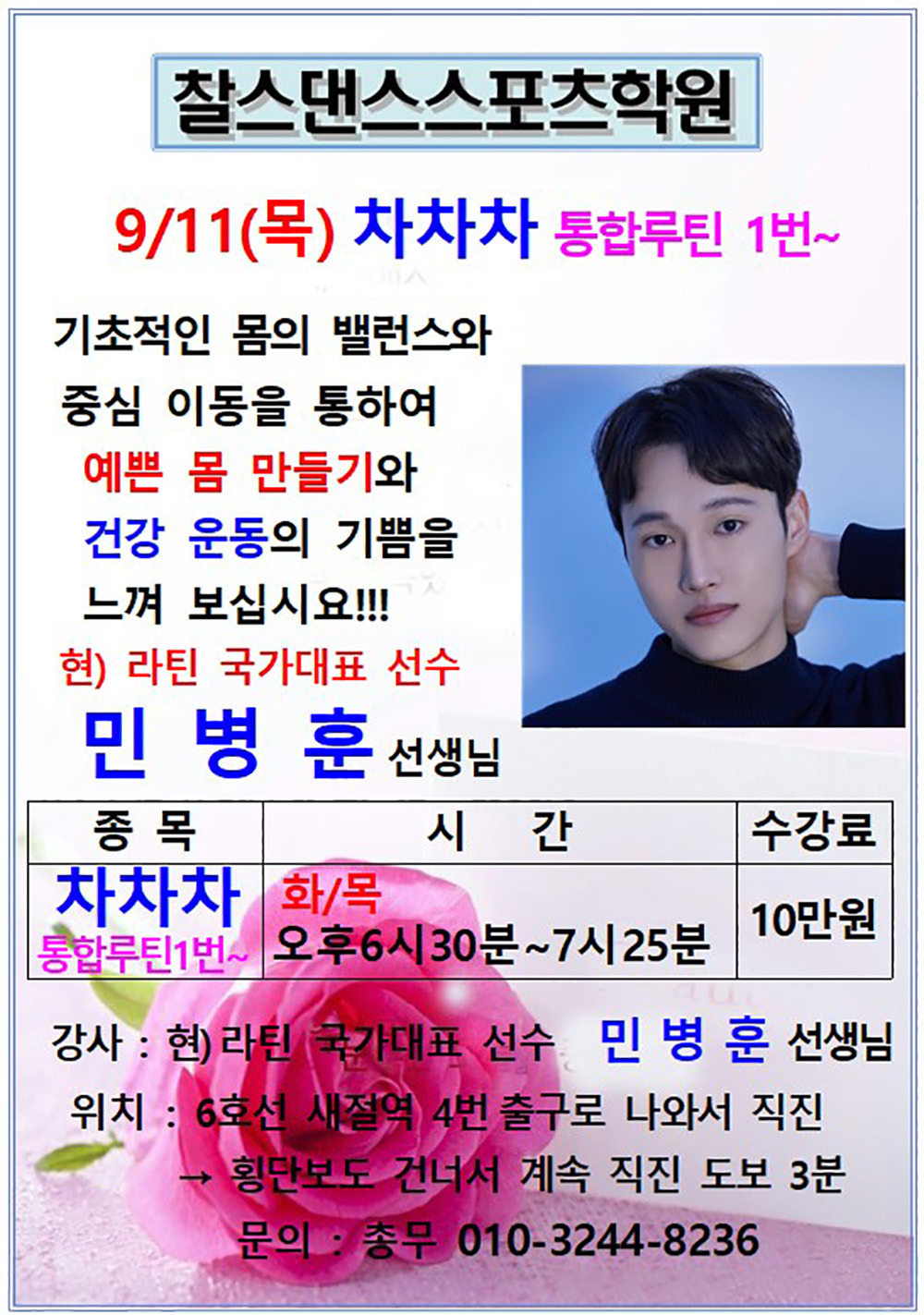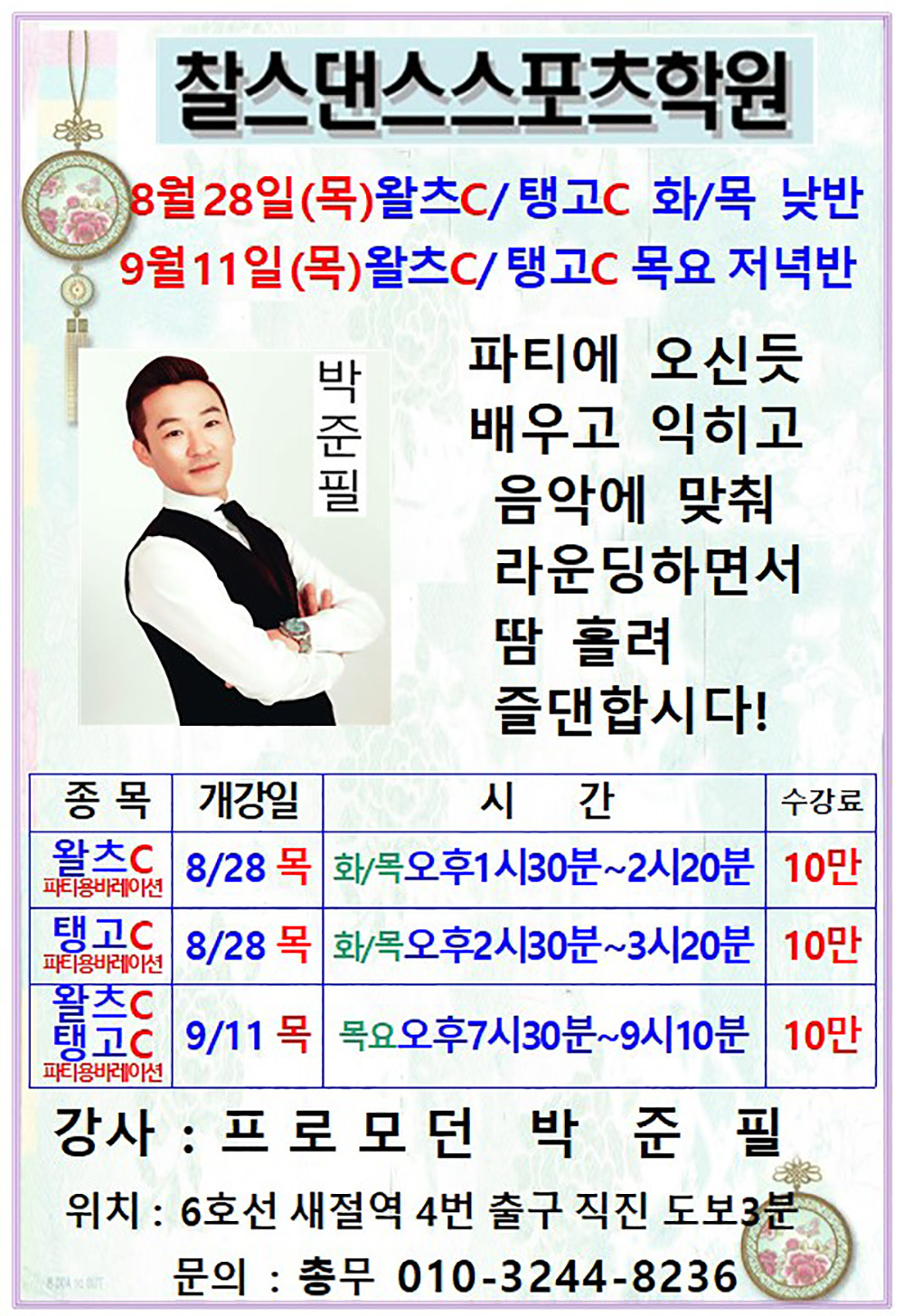 찰스댄스스포츠학원 9월 단체반 전체 시간표 작성자해맑은미소|작성시간25.09.08|조회수180 목록 댓글 0 글자크기 작게가 글자크기 크게가 다음검색 현재 게시글 추가 기능 열기 북마크 공유하기 신고 센터로 신고 댓글 댓글 0 댓글쓰기 답글쓰기 댓글 리스트