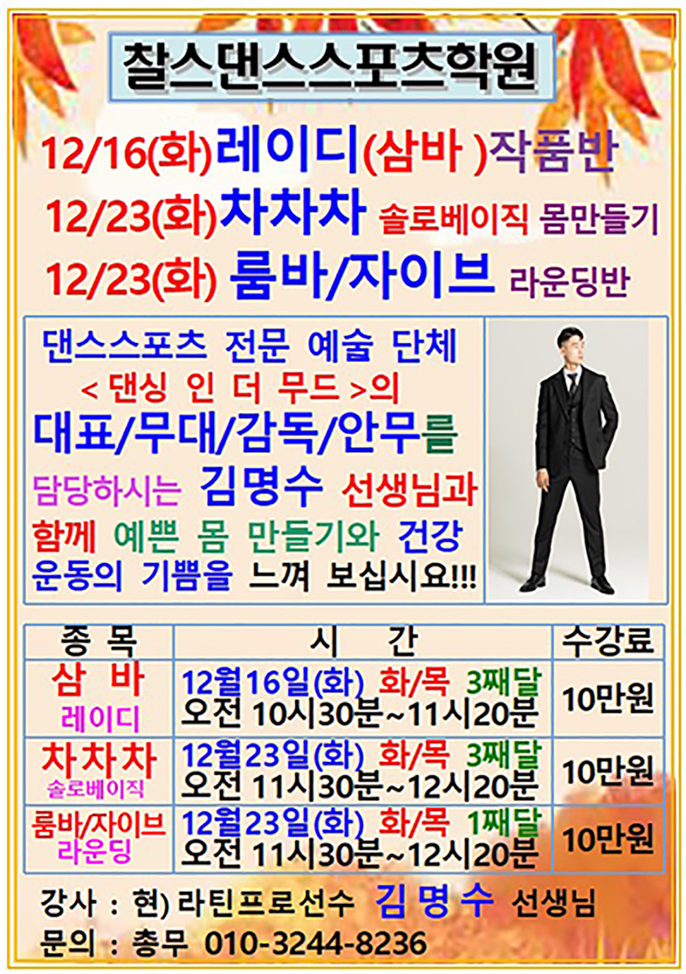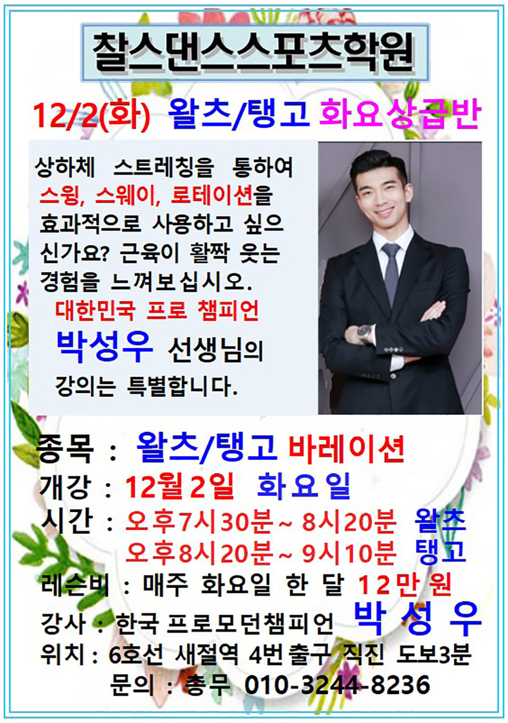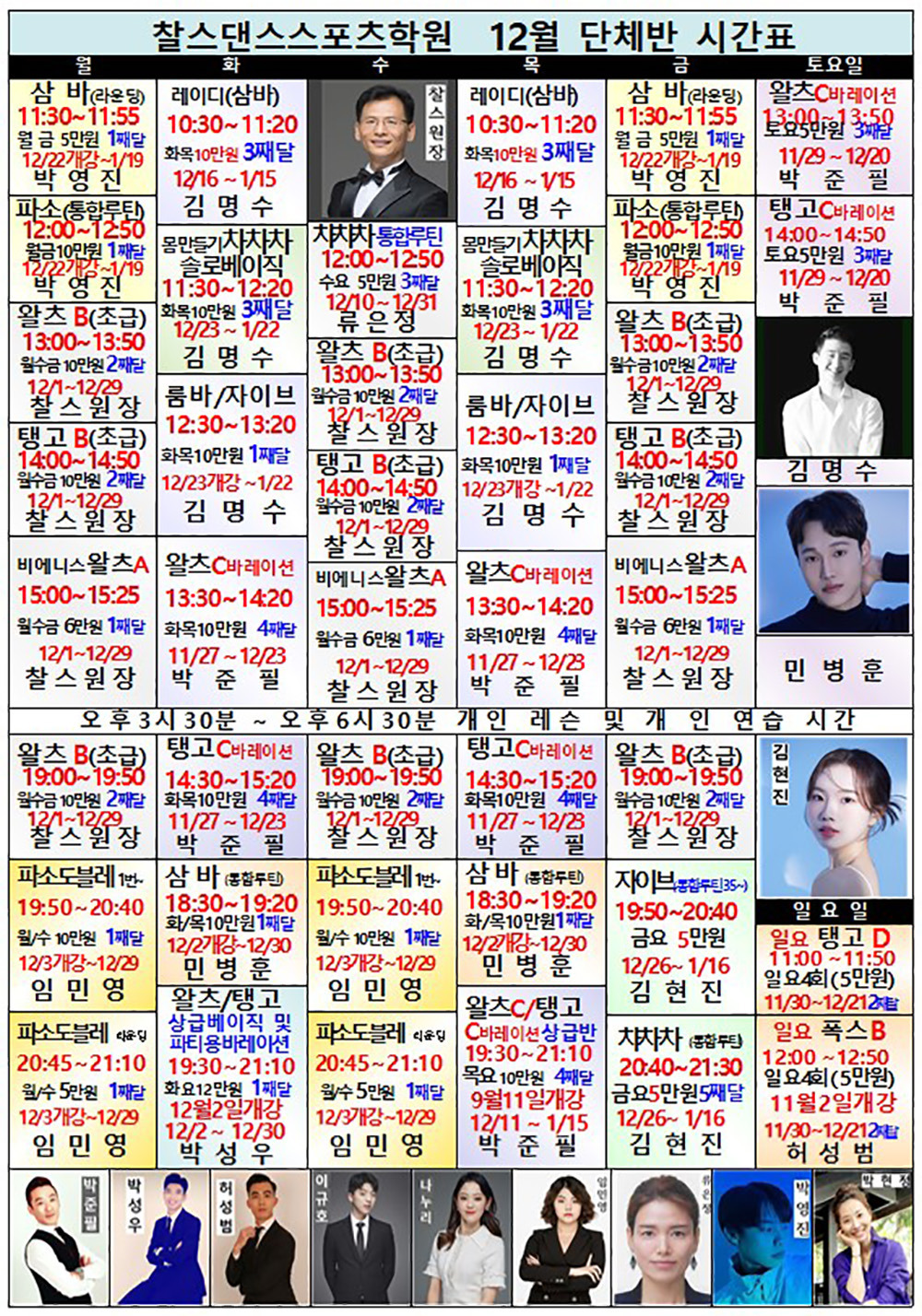 찰스댄스스포츠학원 단체반 전체시간표 (2025년 12월) 작성자해맑은미소|작성시간25.11.27|조회수145 목록 댓글 0 글자크기 작게가 글자크기 크게가 다음검색 현재 게시글 추가 기능 열기 북마크 공유하기 신고 센터로 신고 댓글 댓글 0 댓글쓰기 답글쓰기 댓글 리스트