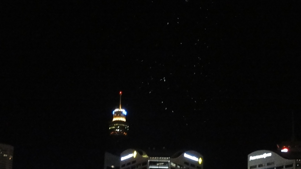 시드니 타워 주변의 갈매기들의 군무(타워 오른쪽에 흰 점들이 갈매기들로 몇시간씩 계속 원형으로 날아 다님. 갈매기들의 나이트클럽을 연상켜 하며, 낮에 많이 먹고 밤에 운동하여 살을 빼는 것 같습니다)