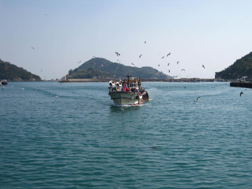지난 토요일 집사람과 삼천포를거처 남해를 다녀 왔지요! 멸치 철이라 바다에서 바로 잡아온 싱싱한 멸치를 사기위하여 부두에서 오는배를 기다리는데 마침 멸치잡이 배가 갈매기의 환호와 호위속에 들어 오는 장면을 잡았습니다.