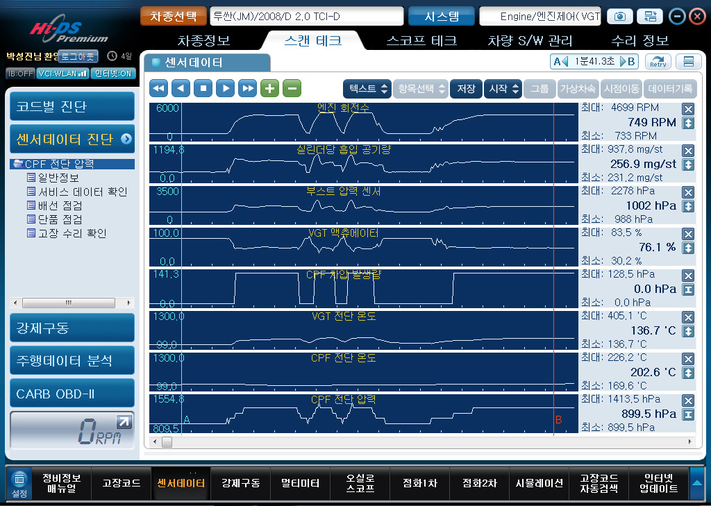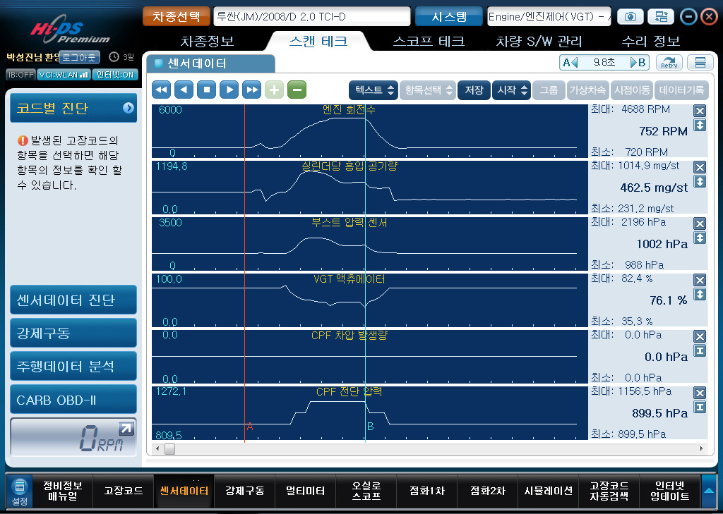 엔진 회전수, 공기량, 차압량을 보면