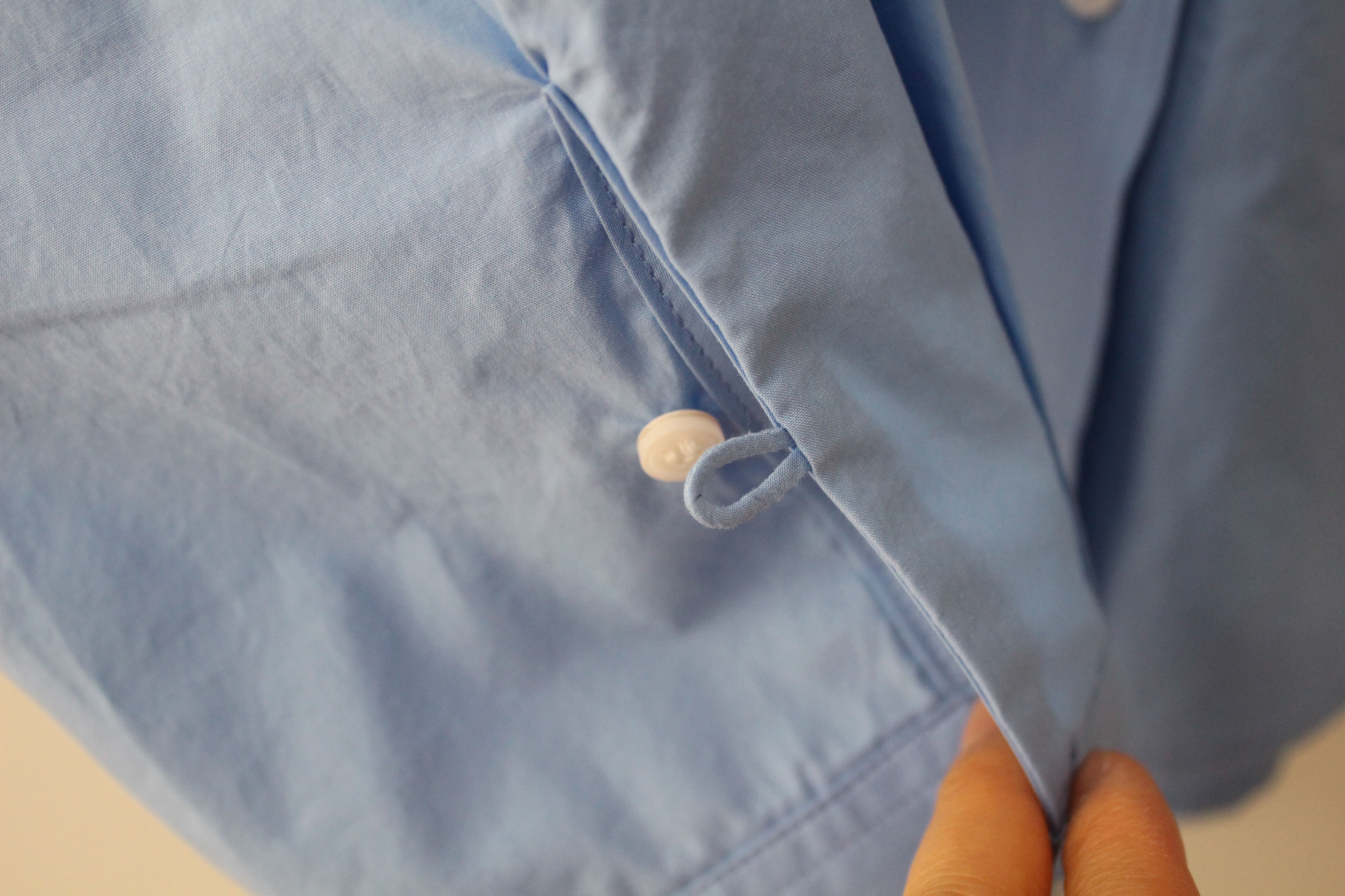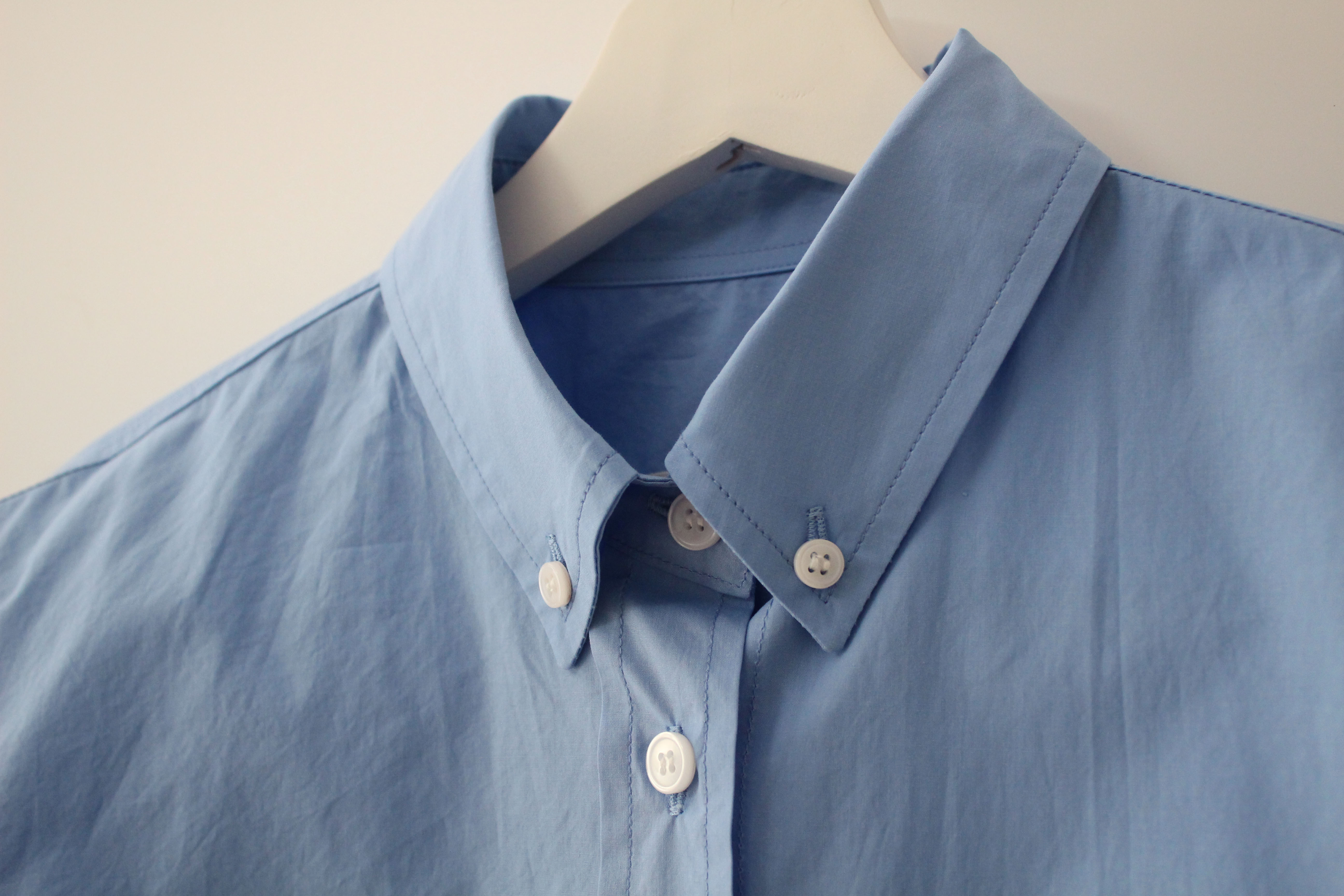카라에 작은 단추를 끼우면 카라가 느슨해지지 않고 반듯하게 서 있어요