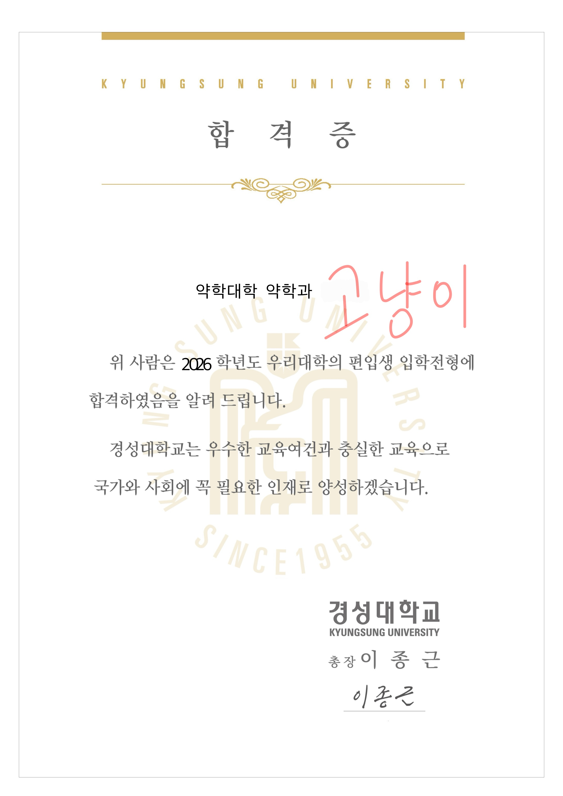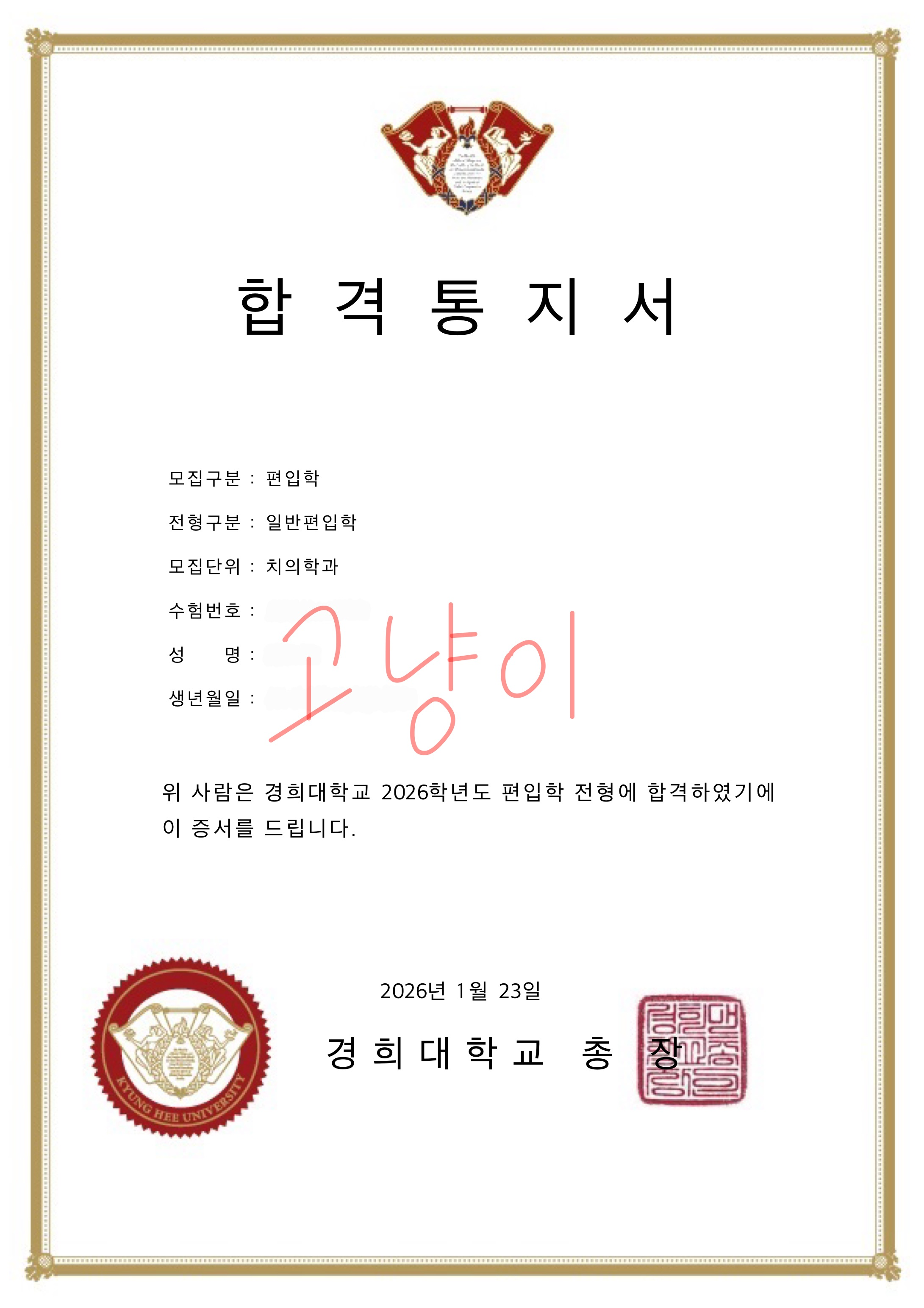 고등학생때 부터 1지망이었던 경희대 치대에 이렇게 합격하니 정말 기쁘네요!! ㅎㅎ