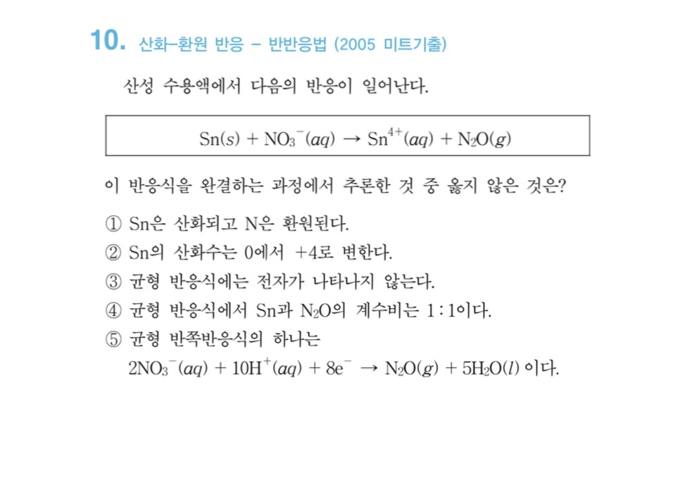 내공.3장.10번 작성자Asdfg|작성시간21.05.09|조회수237 목록 댓글 1 글자크기 작게가 글자크기 크게가 작년도 교재입니다.4번 보기에서 균형 반응식이 Sn+2NO3(-)+10H(+)+4e(-)→Sn(4+)+N2O+5H2O 이면 1:1 아닌가요? 다음검색 현재 게시글 추가 기능 열기 북마크 공유하기 신고 센터로 신고 댓글 댓글 1 댓글쓰기 답글쓰기 댓글 리스트 작성자박인규 | 작성시간 21.05.09 질문의 균형반응식이 잘못됐습니다전자가 없어야합니다 댓글 전체보기
