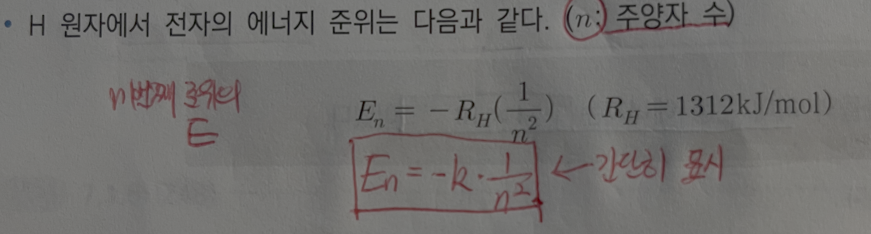 이고, 문제에서 k (이온화 에너지)가 주어지면 En = -k*1/n^2을 사용해서 풀면 된다고 말씀해 주셨습니다. 근데, 줌달로 복습을 하는 과정에서: