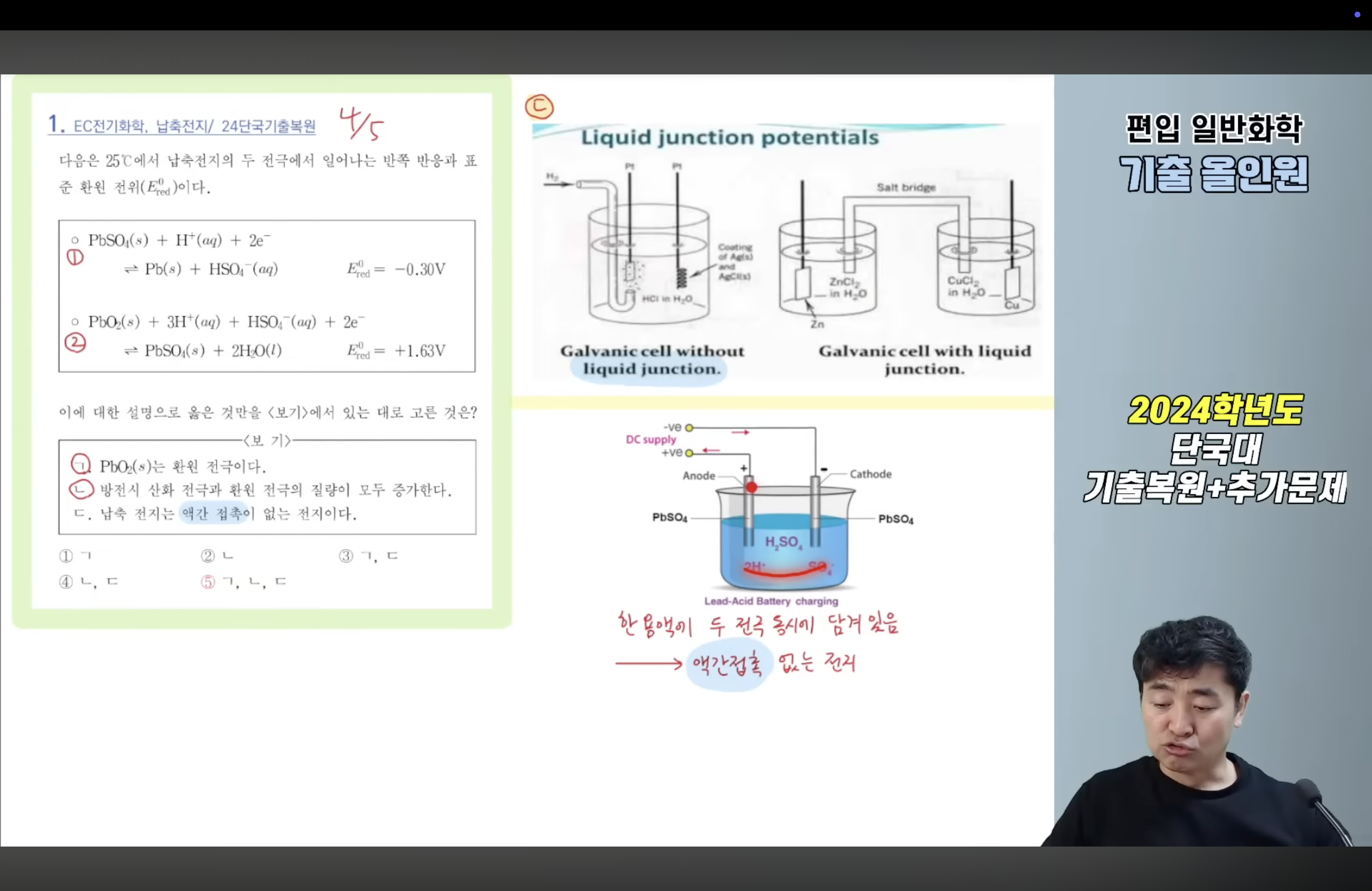 작성자박인규 작성시간 25.12.19 제가 찾은 출처들에서는 공통적으로 액간접촉이 있으려면 서로 다른 조성의 두 용액이 있어야합니다. 수업에서 말씀드린대로, 납축전지는 전해질 용액이 하나 뿐이므로 액간접촉이란 개념이 적용될 수 없습니다.