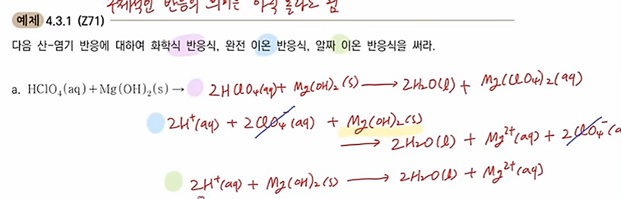 작성자박인규 작성시간 26.02.13 이 반응은 산염기 반응입니다. 나중에 자세히 배우게 됩니다. HClO4에서 나온 H+와 Mg(OH)2에서 나온 OH-가 결합해서 물이 되는 반응입니다. 핵심이론에서는 완전히 이해하면서 진도를 나가려고 하면 안됩니다. 대략적인 흐름만 이해하면서 전범위를 여러번 공부하는게 효율적입니다. 아직 전체 그림에 대한 이해가 부족한 상태기때문에 처음 진도나갈 때 완전히 이해하려고 하는것은 불필요하게 2~3배 시간과 노력을 낭비하는 방법입니다. 초반에 말씀드렸던 일반화학 공부방법을 철저히 따라야 고생을 덜 할 수 있습니다.