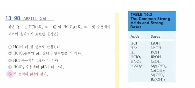 13-98번에서 table로 주신 강산, 강염기 자료에서 궁금한 점이 있습니다.