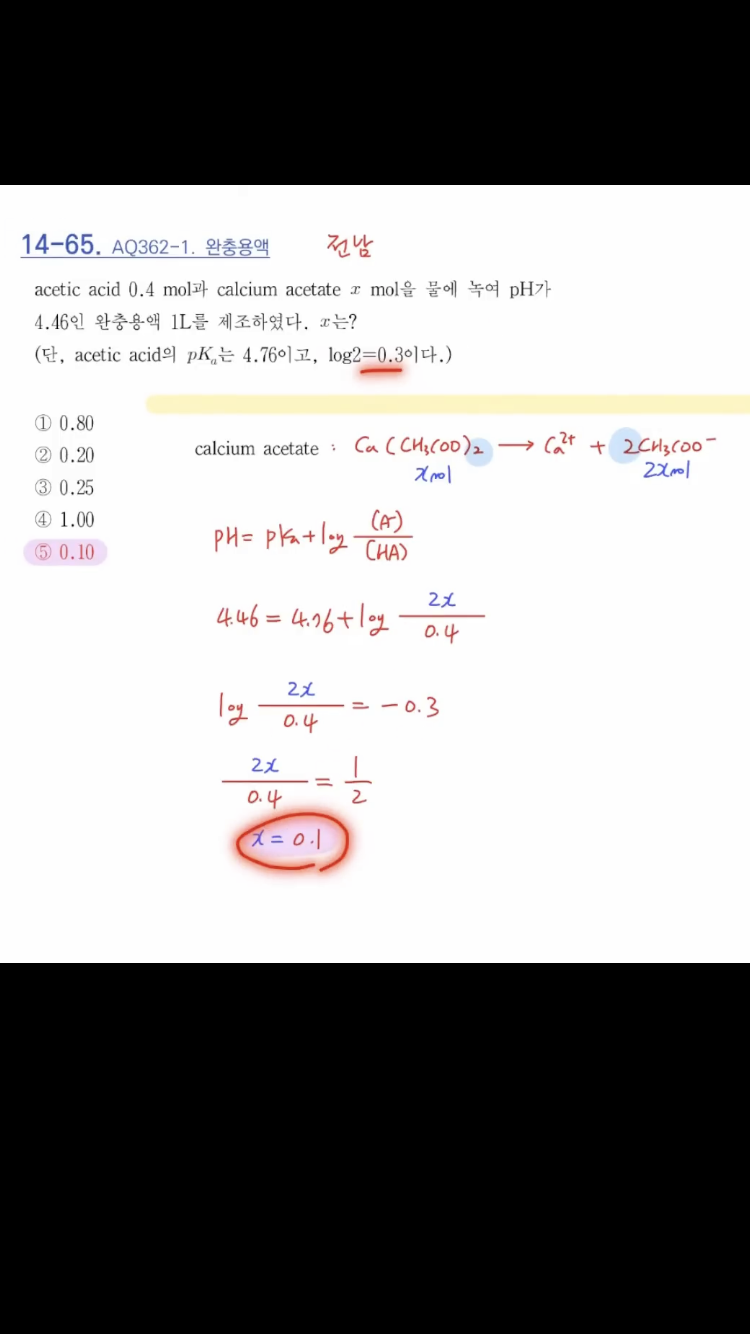 안녕하세요 선생님, 14-65번 문제 위의 내용에서 짝염기로 작용하는 아세트산칼슘이 물에 녹으면 칼슘과 아세트이온으로 해리되면서 물한테 수소를 받고 아세트산이 되지않고 2개의 아세트이온이 되는 이유가 궁금합니다.