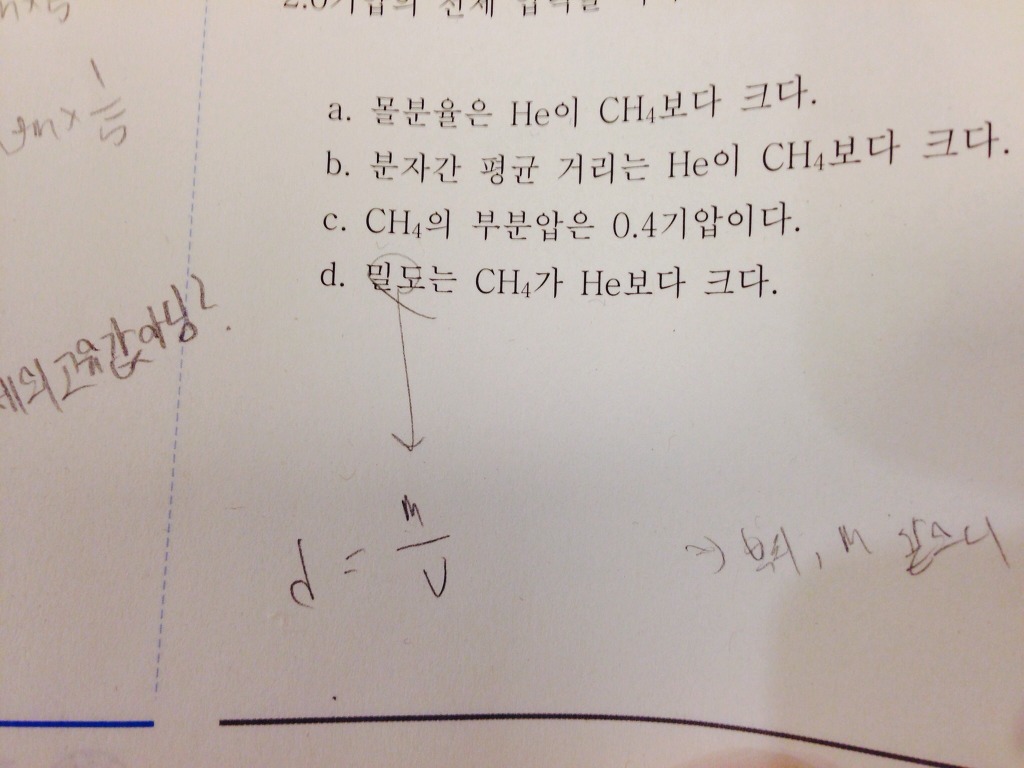선생님 밀도관련해서 질문이요~~ 작성자조현우|작성시간15.01.14|조회수218 목록 댓글 1 글자크기 작게가 글자크기 크게가 안녕하세요 선생님 d에서 밀도 구할때 식을써서 d=m/v로 구하면 두개의 물체의 질량과 부피가 같을 경우 밀도가 같게되는되 물같이 1g/ml로 정해진건 먼가여... 물은 어떤상황에서든 1로 정해진건가요? 아님 물도 상황에 따라 다른가요..? 다음검색 현재 게시글 추가 기능 열기 북마크 공유하기 신고 센터로 신고 댓글 댓글 1 댓글쓰기 답글쓰기 댓글 리스트 작성자박인규 | 작성시간 15.01.14 우리가 지금 다루는 밀도는 기체의 밀도입니다. 기체의 밀도는 물질의 종류 뿐 아니라 온도, 압력에 따라서도 달라집니다. 액체 물의 밀도는 온도나 압력에 따라 매우 약간 변합니다. 4도씨 1기압에서 물의 밀도는 정확히 1.00g/mL입니다. 댓글 전체보기
