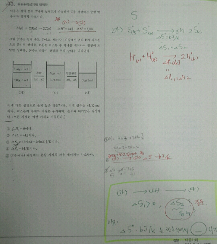 델타S노트값인 b가 반응식으로부터 음수값이라는 것을 알아내고, 델타S1은 양수라는 걸 계산(정량적)으로 구한 뒤