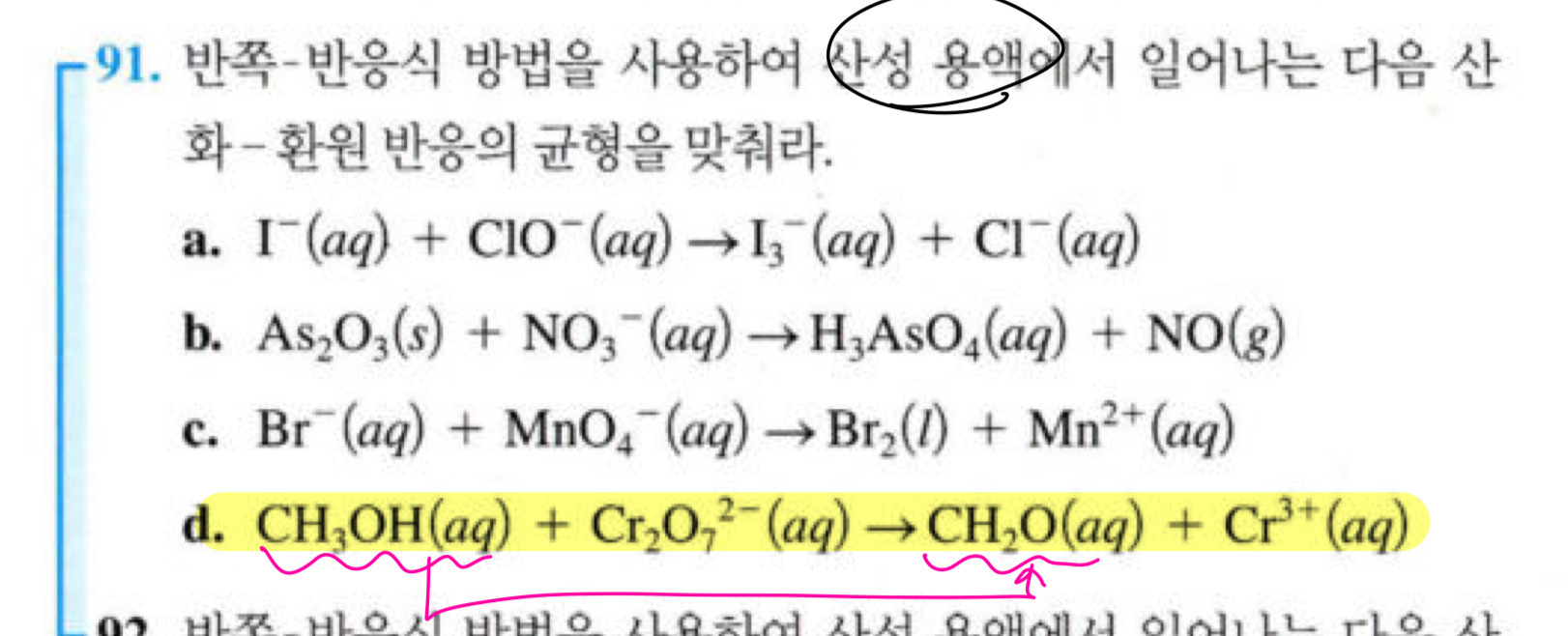 그리고 뒤에 연습문제 91번 d의 경우에 산화반응에는 다 중성이라 전자가 필요없는데 환원반응식에 있는 전자를 어떻게 없애야하나요?