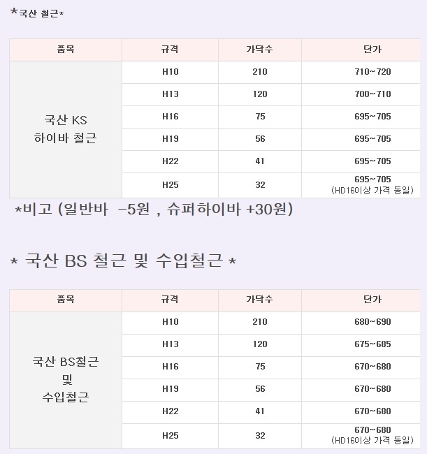 2013년 2월 19일 철근시세 (톤당개념이 아닌 키로그램당 단가표이며 부가세는 별도임)