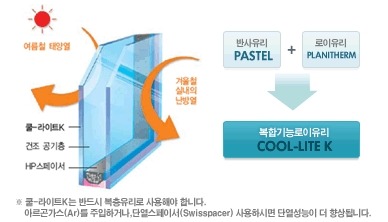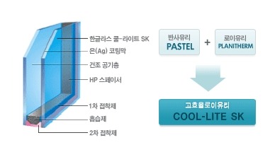 한글라스 플래니썸은 판유리의 한쪽 면에 얇은 은(Ag)막을 코팅하여 만드는 제품으로, 태양의 가시 광선을 대부분 투과시키고, 태양열선의 상당부분을 반사시키는 특징이 있습니다. 특히 겨울에는 실내의 난방열을 다시 실내측으로 반사시켜 실내의 온기가 바깥으로 빠져 나가지 않도록 하므로 에너지 절약 관점에서 탁월한 제품입니다.