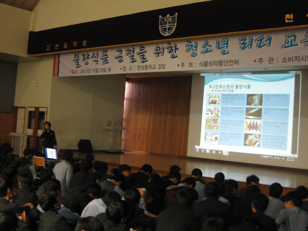 2013년 10월 29일(화) (사)소비자시민모임 충남지회 신미자 지회장은 천안 천성중학교 1-3학년재학생(647명)들을 대상으로 학교앞 불량식품과 어린이 안전보호지역에서 어린이 유해식품이나 불량식품에 대한 안정성 및 식생활 안전관리 특별법에 관한 법률등 위해식품의 유형, 건강기능식품 허위 과대광고 사례피해예방을 위한 소비자 행동요령, 표시사항 살펴보기에 대한 교육을 가졌으며, 청소년기에 흔히 접할수 있는 불량식품 근절을 위해 우리모두 노력하자라며 함께 다짐을 하는 시간을 가졌다.