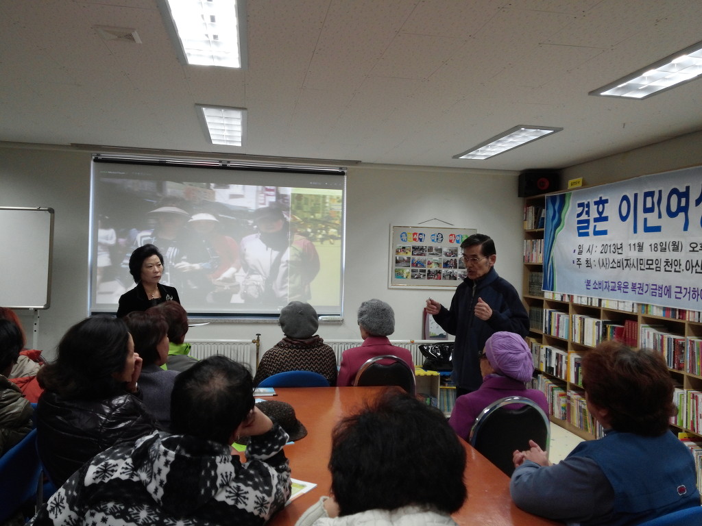 2013년 11월 18일(월) 결혼이주민 여성 소비자 교육(심화과정)을 충남 서천군 서천사곡휴먼시아 이주민센타에서 이주민여성 21명과 남성 18명에게 소비자 교육 심화과정을 가졋다. 지난번 기초과정에서 배운 청약철회나 합리적인 구매방법, 카드결재방법등에 대해 다시한번 각인시켜주고, 그동안 생활하면서 불편을 겪었던 문제점에 대한 질의응답시간을 가졌으며, 지난번보다 더 화기애애한 분위기속에 교육을 할수 있었다. 교육후 한분한분 인사를 하시면서 다음번에도 꼭 교육을 오시라고 인사를 하였다.