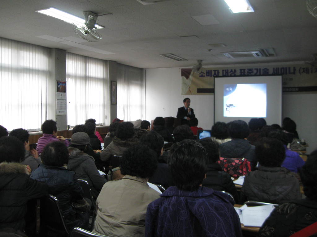 첫번째 표준학회 신명재 부회장님으로 소비자 관점에서 본 표준의 의의, 보건 음용수 수질기준 허용잔류농약기준및 식품위생 안전기준에대해 강의를 가졌으며, 두번째 지식경제부 기술표준원 주력산업표준과 박주승과장님이 표준환경과 한국의 표준화 정책에서 공정한 상거래 및 소비자 피해예방을 위한 계량 제도 확립이란 내용으로 강의를 하였다.