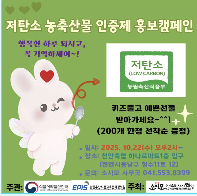 2025년 저탄소 농축산물 인증제 캠페인 작성자소시모|작성시간26.01.26|조회수3 목록 댓글 0 글자크기 작게가 글자크기 크게가 다음검색 현재 게시글 추가 기능 열기 북마크 공유하기 신고 센터로 신고 댓글 댓글 0 댓글쓰기 답글쓰기 댓글 리스트