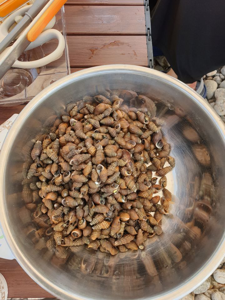 허리 아퍼라 잡은 다슬기도 모우고나니 한 땟꺼리는 충분히 잡았다 잡는것보다 힘듬이 하나하나 속을 뽑아내는 일이 지옥이다ㅋ