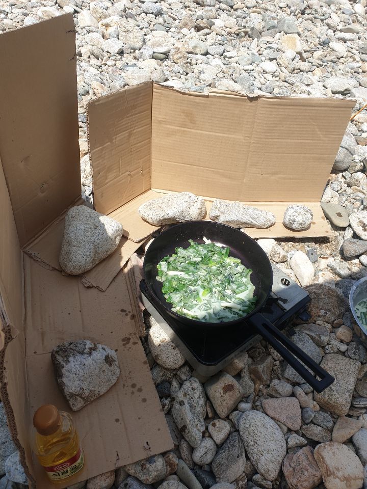 전날 잡은 다슬기로 부침를 부쳐서 오는날 점심으로 맛깔나게 한 끼를 먹는다