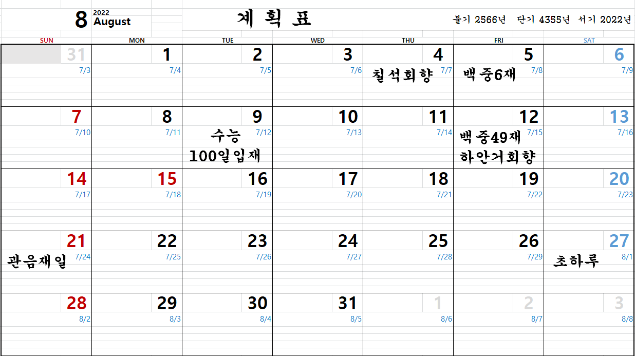임인년 8월 월중행사 및 계획표 작성자맑고 향기롭게|작성시간22.07.31|조회수42 목록 댓글 0 글자크기 작게가 글자크기 크게가 8월스케줄.png44.22KB다운받아 사용하세요. 첨부파일첨부된 파일이 2개 있습니다. png 파일 8월스케줄.png 다운로드 png 파일 8월스케줄.png 다운로드 다음검색 현재 게시글 추가 기능 열기 북마크 공유하기 신고 센터로 신고 댓글 댓글 0 댓글쓰기 답글쓰기 댓글 리스트
