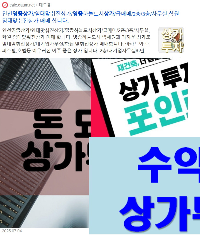 작성자대토용작성시간25.08.14조회수50 목록 댓글 0인천상가매매/인천급매물상가/인천 대물상가 50% 처분합니다.....인천 수익율상사/임대맞춰진상가 급매매......50%할인매매/반값정리매매 .....