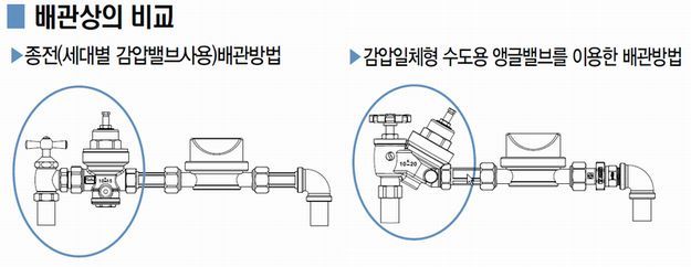 - 아파트 및 오피스텔 등의 세대별 급수에 사용되는 밸브로 종전 수도용 앵글밸브에 감압기능과 첵크기능을 추가한 밸브로서 별도의 감압밸브 설치가 필요없다.