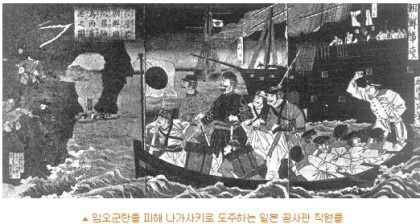 또 그 날 저녁에는 일본 공사관을 포위·습격했다. 일본 공사 하나부사 요시모토등 일본 공관원 전원은 인천으로 도피했고, 공사관 건물은 불탔다.