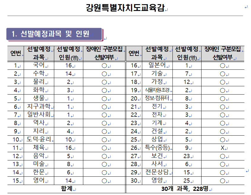 [강원도] 2024학년도 중등교사 신규임용 사전 예고(16명) 작성자카페운영자|작성시간23.08.09|조회수58 목록 댓글 0 글자크기 작게가 글자크기 크게가 [강원도][붙임]2024학년도 강원특별자치도 공립 중등학교 교사, 보건·사서·전문상담·영양·특수(중등)교사 임용후보자 선정경쟁시험 사전예고.hwp179.50KB 첨부파일첨부된 파일이 2개 있습니다. jpg 파일 bandicam 2023-08-09 15-16-00-468.jpg 다운로드 hwp 파일 [강원도][붙임]2024학년도 강원특별자치도 공립 중등학교 교사, 보건·사서·전문상담·영양·특수(중등)교사 임용후보자 선정경쟁시험 사전예고.hwp 다운로드 다음검색 현재 게시글 추가 기능 열기 북마크 공유하기 신고 센터로 신고 댓글 댓글 0 댓글쓰기 답글쓰기 댓글 리스트