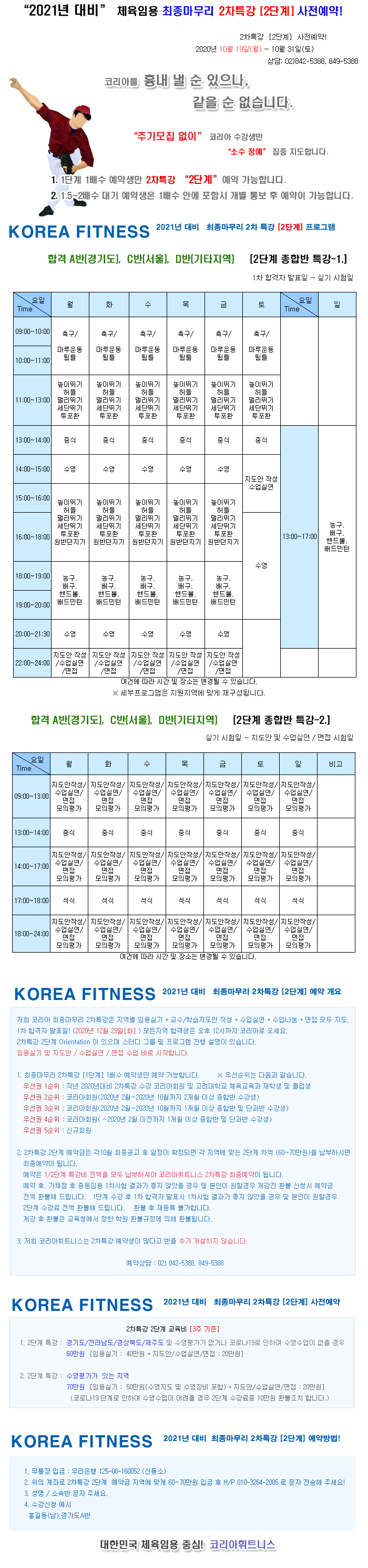 2021년 대비 코리아휘트니스 2차특강 1단계 및 2단계 1단계 : 필기시험 다음일 ~ 1차 합격자 발표전일까지. 2단계 : 1차 합격자 발표일 ~ 시험일(실기/수업실연/면접)까지. |