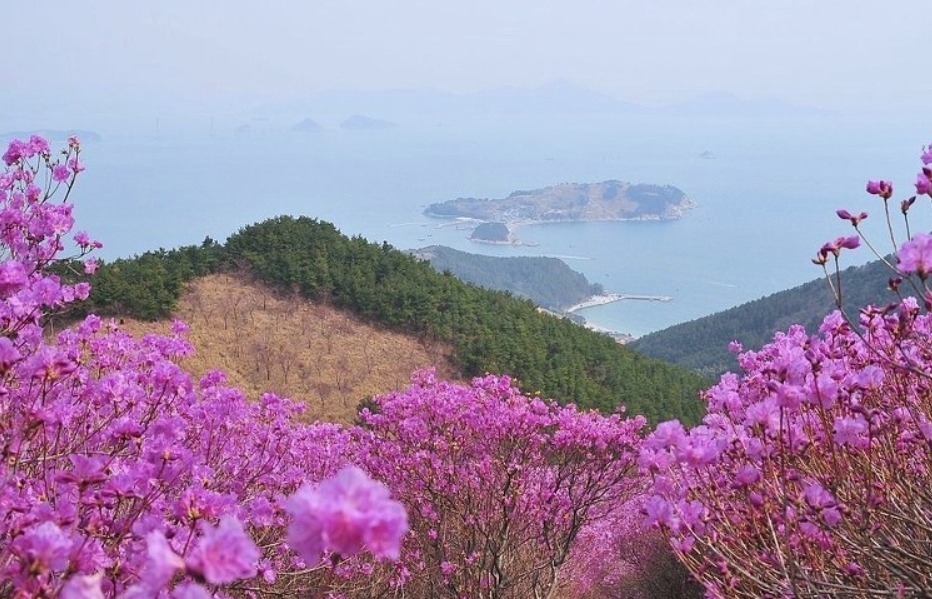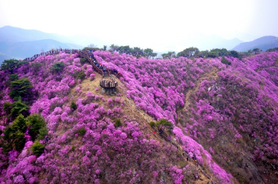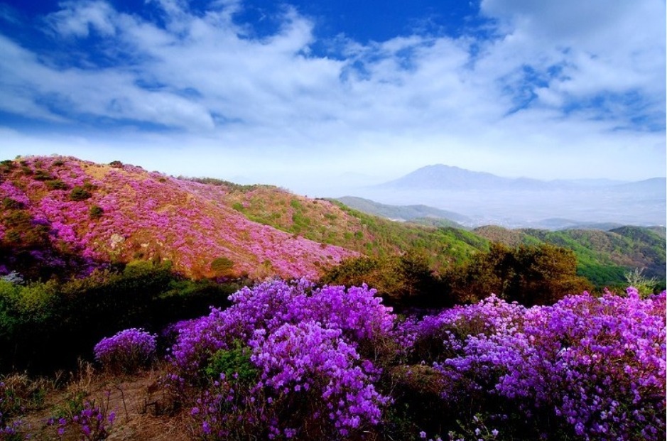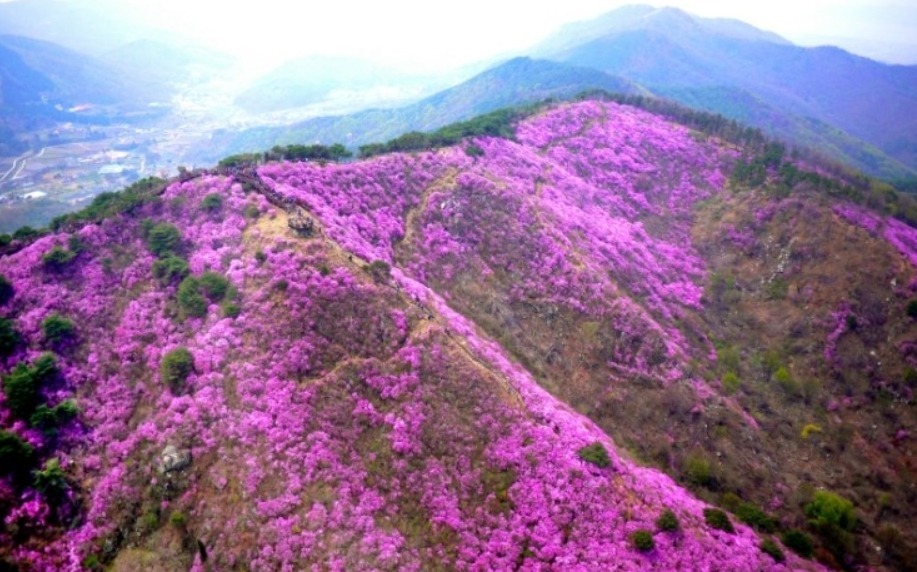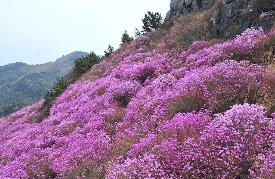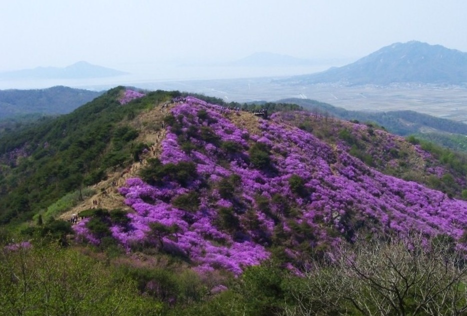 특히 낙조봉까지 4킬로미터 능선 20여만평을 진달래 꽃밭이 수놓는다.