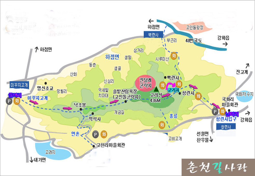 걷기코스 :청련사- 고려산- 진달래 군락지-솔밭 산림욕장-낙조봉-미꾸지고개