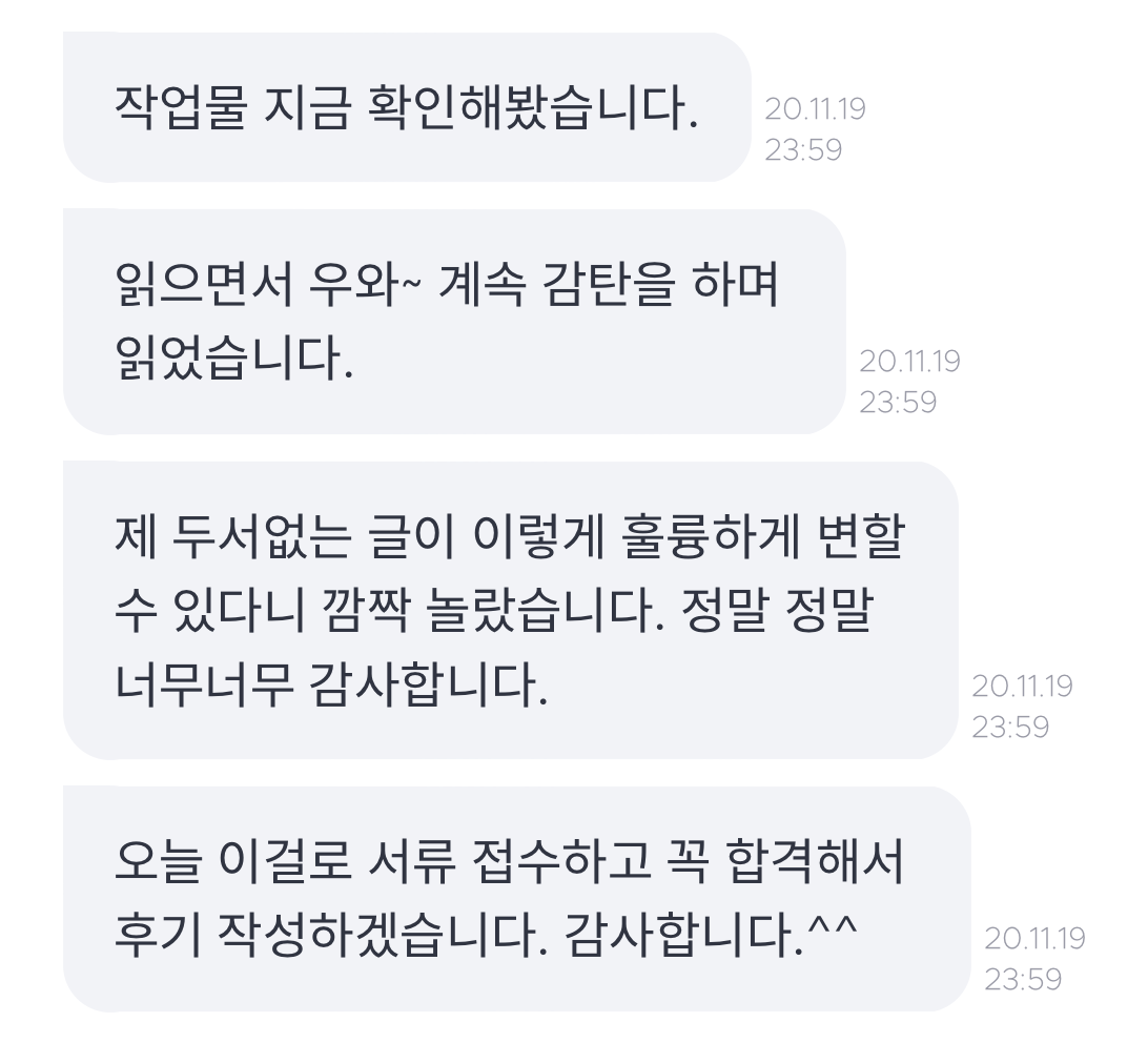 '합격하소서' 에디터는 고려대학교 철학/국문학을 졸업했습니다. 2020년에는 신문사 신춘문예 본심에 오르기도 했습니다. 즉, 뛰어난 글쓰기 능력을 검증받은 에디터입니다. 다시 한 번 말하지만, 첨삭은 무엇보다 글을 잘 쓰는 에디터에게 맡겨야 합니다.