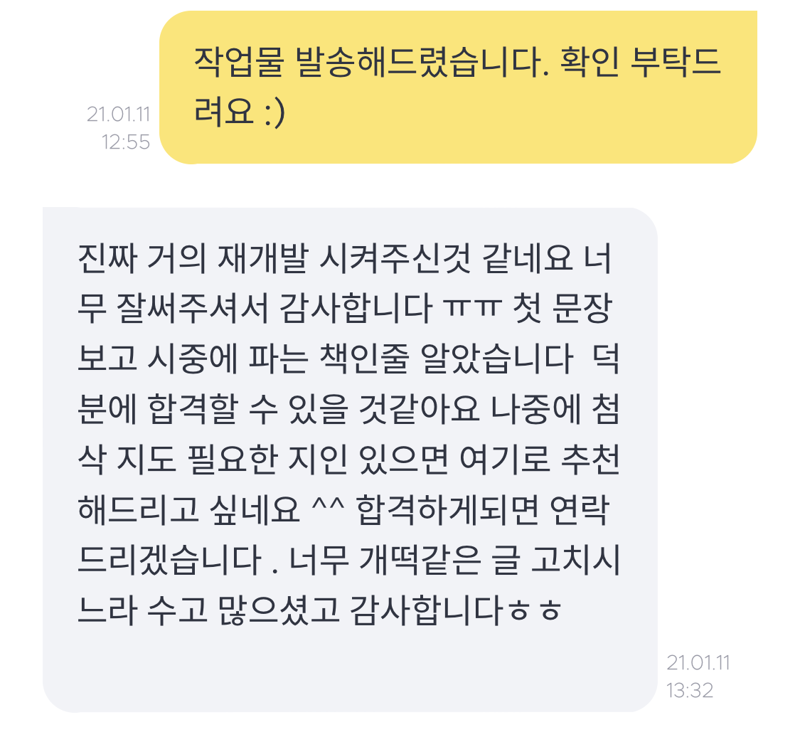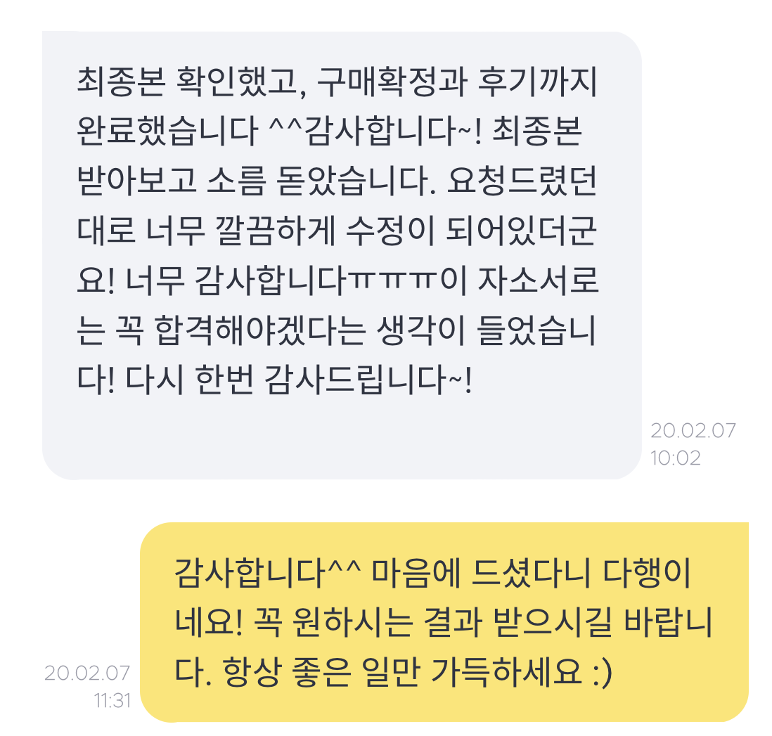 프로 의식을 갖고 자기소개서 전문 첨삭 업체를 창업한 후 9년 동안 많은 자소서를 첨삭했습니다. 그 과정 속에서 셀 수 없는 합격이 탄생했습니다. 맡겨주시면 제가 지원한다고 생각하고 최선을 다해 작업하겠습니다. 감사합니다.