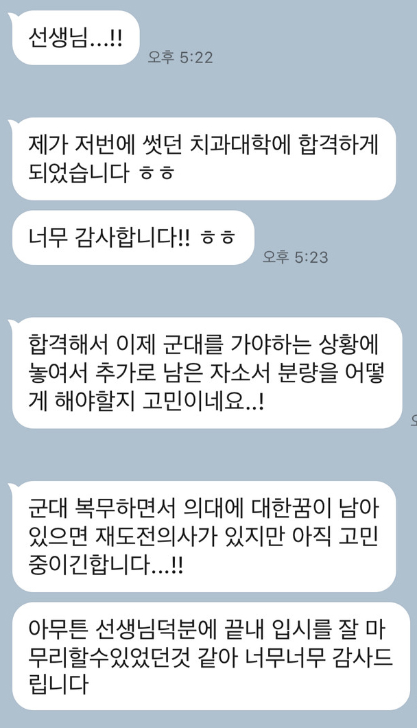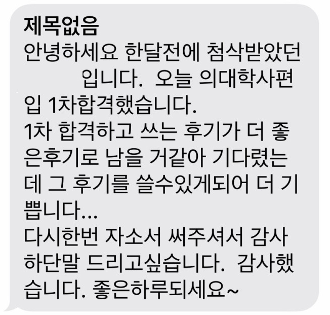 한편으로는 2015년부터 수백 직군의 자소서를 작업하며 다양한 분야에 대한 이해를 길러왔습니다. '합격하소서'는 해당 분야에 대한 전문성을 바탕으로 첨삭을 진행합니다. 이러한 강점 덕분에 첨삭을 거쳐 의사의 길을 걷게 된 문과생들도 계실 정도입니다.