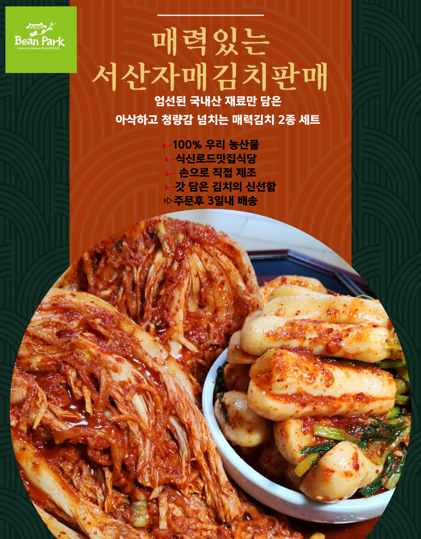 자연그대로의 청정치역 충남서산에서 정성을 들여 만든 100% 우리 농산물 서산자매김치를 준비했습니다.