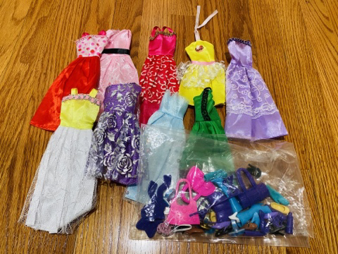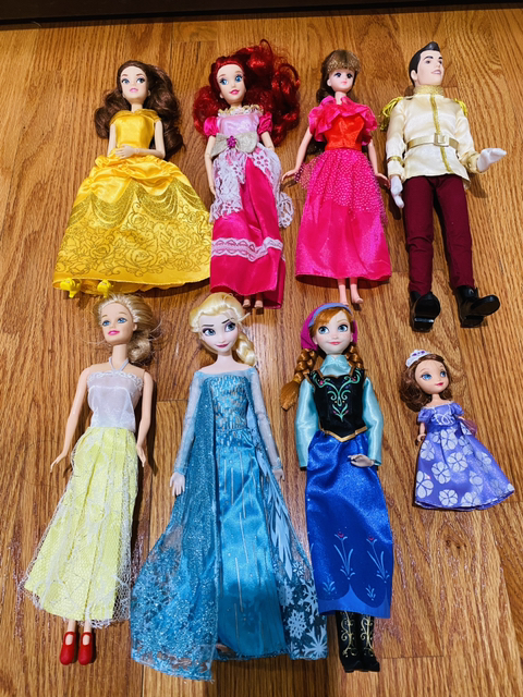 2. 디즈니, 바비 인형 8명 + 의상 ($20): 벨, 아리엘, 미미, 왕자, 바비, 엘사, 안나, 소피아 (사진순서)