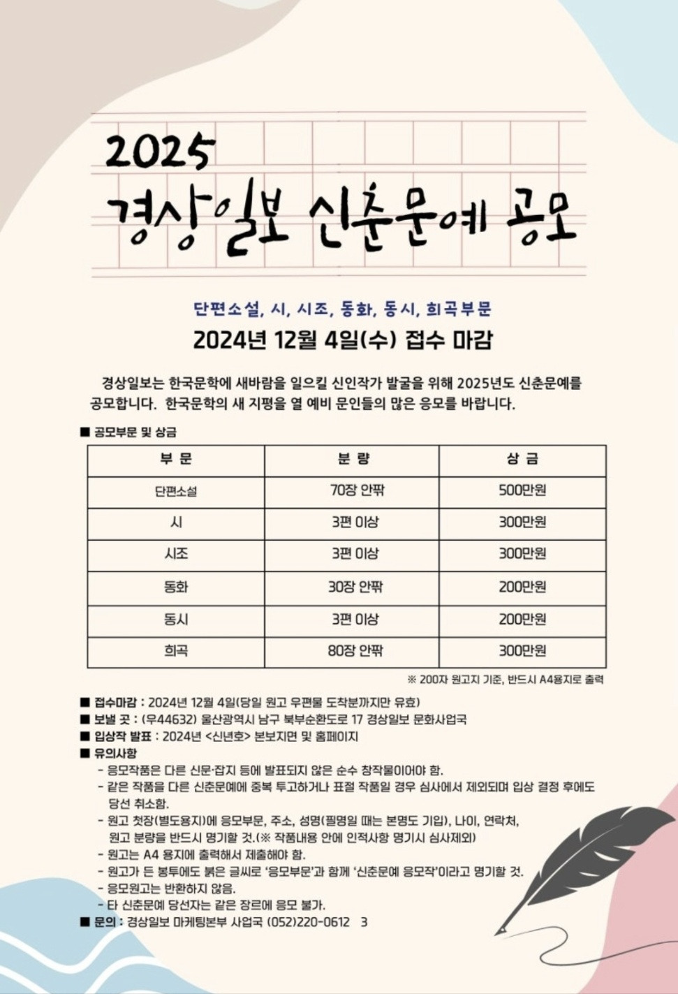 - 같은 작품을 다른 신춘문예에 중복 투고하거나 표절 작품일 경우 심사에서 제외되며 입상 결정 후에도 당선 취소함.
