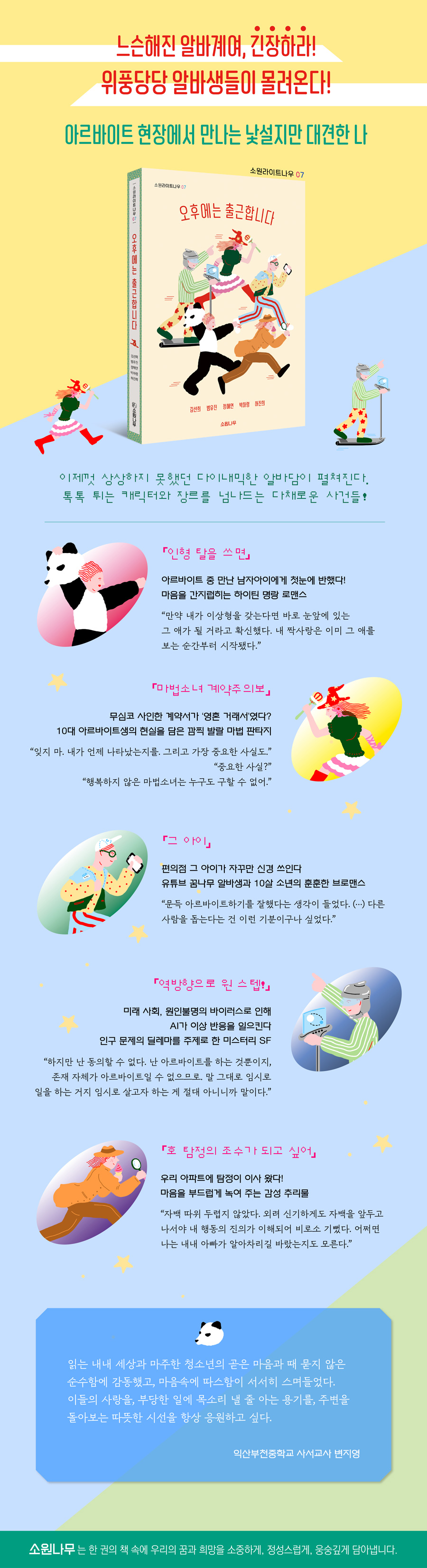 『오후에는 출근합니다』는 ‘아르바이트’를 소재로 톡톡 튀는 캐릭터와 장르를 넘나드는 다채로운 사건을 담은 앤솔러지입니다. 학교 밖 현장에서 주체적으로 성장하며 유쾌한 변화를 만드는 청소년의 활약에 주목하는 작품입니다. 각 작품 속 주인공은 일을 통해 자기 안에 숨겨진 가능성을 발견하게 되고 작은 용기가 가진 영향력을 목격하게 됩니다.