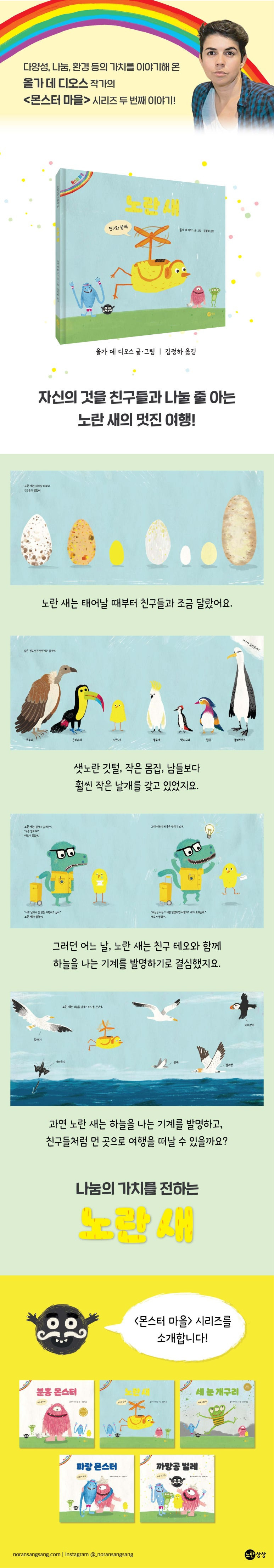 《노란 새》는 스페인 작가 올가 데 디오스가 쓰고 그린 몬스터 마을 시리즈의 두 번째 그림책입니다. 작가는 이 시리즈의 첫 책인 《분홍 몬스터》로 2013년에 스페인 아필라 신인상, 스페인 아우렐리오 블랑코상과 상하이 도서전 그림책 부문 황금 바람개비상 등을 수상하기도 했지요. 《분홍 몬스터》가 서로 다름을 인정하고 함께 어우러져 사는 것에 대해 이야기했다면, 《노란 새》는 나누는 것에 대한 가치, 서로를 돕는 것에 대한 중요성을 함께 이야기합니다.