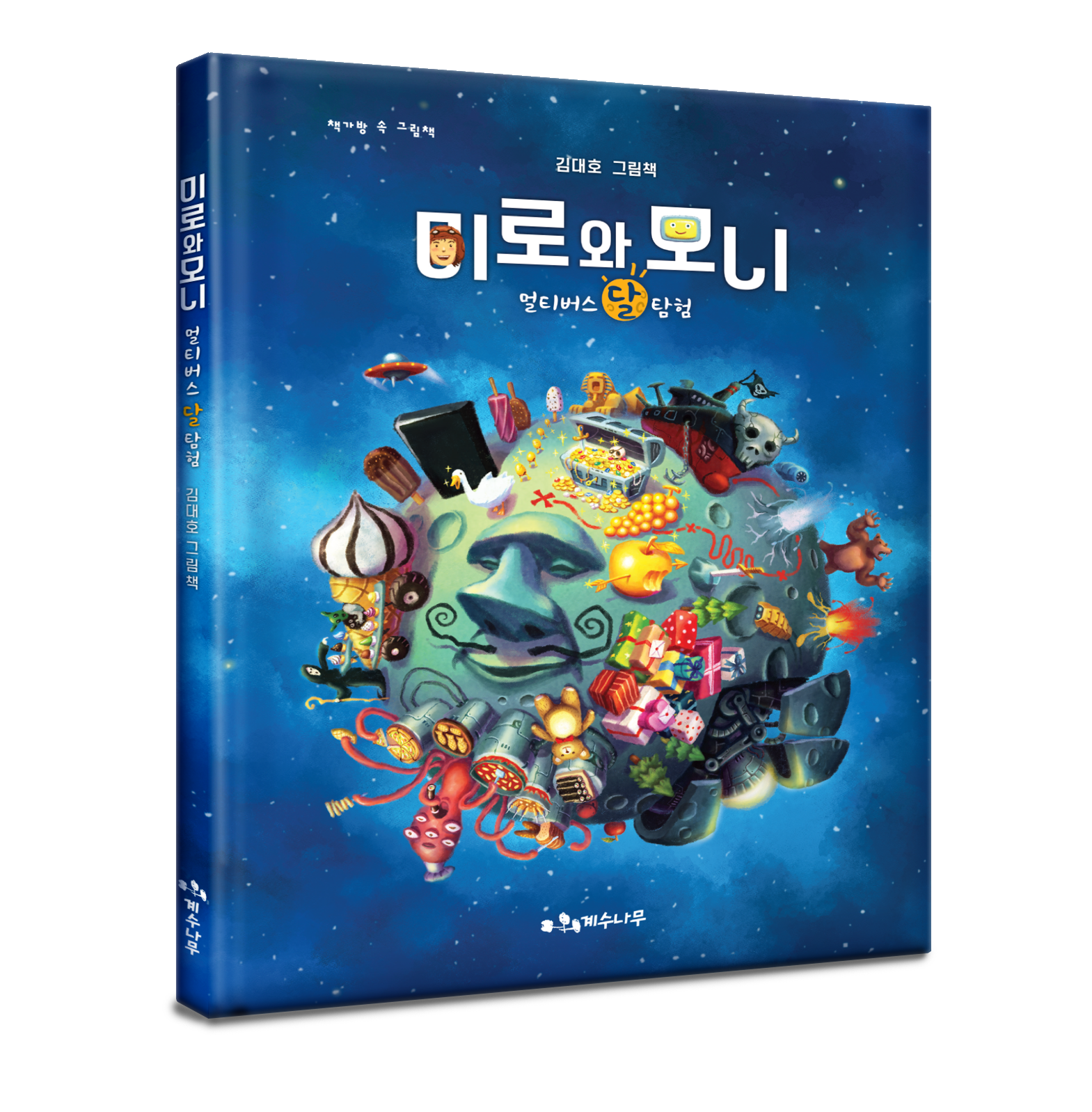 옛 사람들은 ‘달에 토끼가 산다’고 믿었지만, 아폴로 11호 달 탐험으로 달에는 생명체가 없음이 밝혀졌지요. 미로와 모니는 ‘다른 차원의 멀티버스 달 탐험을 결정합니다. 이 여행은 상상에서 출발합니다. 초광속 차원 이동 열기구를 만들어 차원문을 통과하면서 멀티버스 달에 도착합니다. 미로와 모니가 도착한 멀티버스 달에는 치즈가 열리는 나무와 과자나무가 있고, 분화구 온천과 다양한 모습의 생명체도 있었습니다. 그런데 거대한 괴물 ‘토북이’가 삼만 년 만에 잠에서 깨어나는 바람에 여행의 위기가 찾아옵니다. 최신 과학 이론인 멀티버스 개념, 판타지적 상상, 섬세한 그림이 보는 재미를 더합니다.