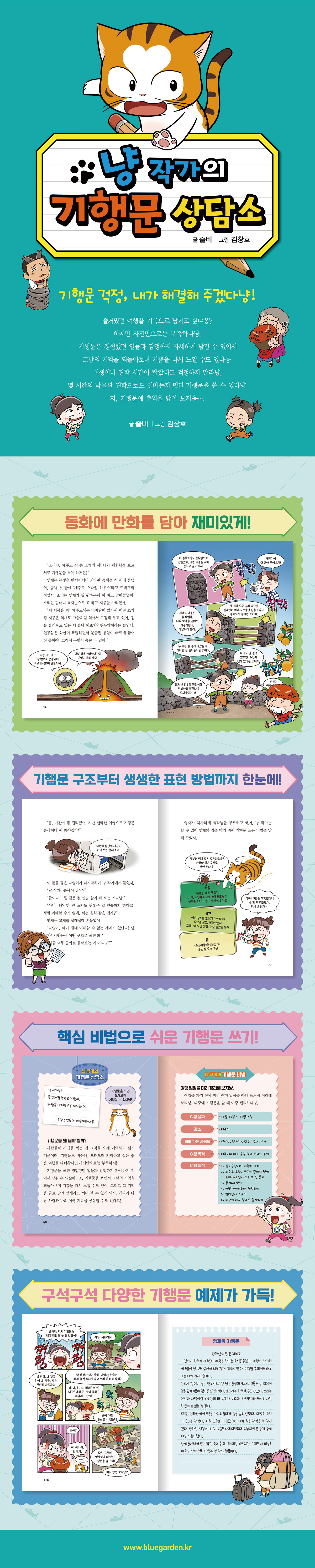 이처럼 기행문 쓰기가 막막하다면 우리 함께 냥 작가에게 기행문 쓰기를 배워 봐요. 기행문의 구조부터 생생하게 표현하는 방법까지 기행문 쓰기를 재미있게 배워 보고·느끼고·생각한 것을 차근차근 풀어 내는 기행문 쓰기로 행복했던 추억을 기록으로 남겨 보세요.