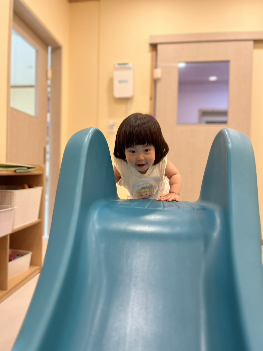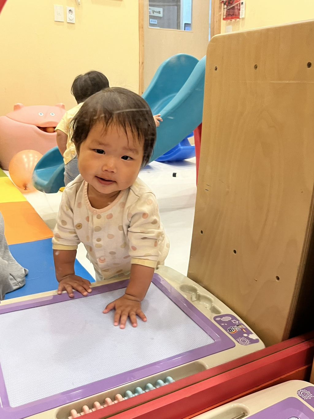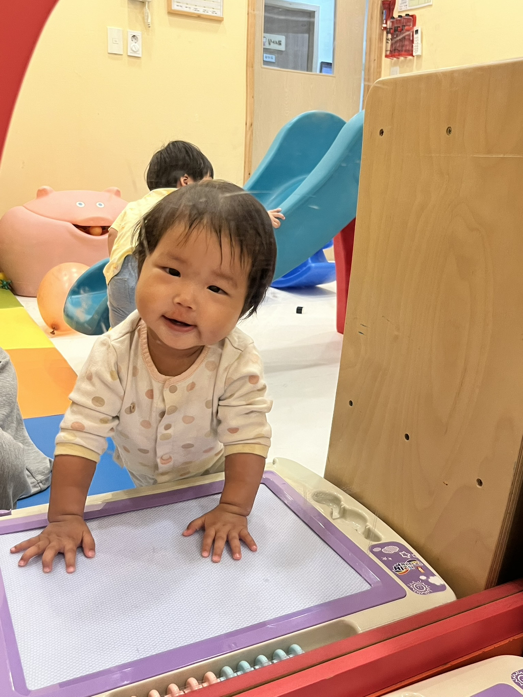 스스로 계단을 올라 미끄럼틀을 신나게 타보는 지유에요~