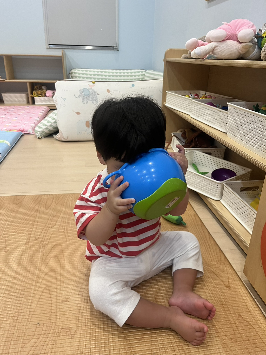 지안이가 냄비 뒤에 숨었다가 깜짝 까꿍 했어요~