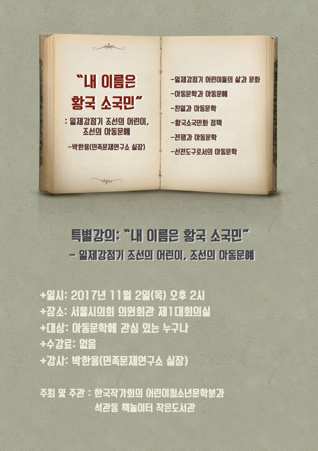 민족문제연구소 박한용 실장님을 모시고 진행하는 이번 강연은 일제 강점기 조선의 어린이와 일본의 황국소국민화정책, 일제강점기 아동문학, 친일 아동문예 등에 대해 폭넓고 깊이 있게 살펴보는 의미 있는 시간이 될 것입니다.