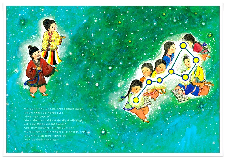 하늘나라 칠성님과 땅나라 옥녀부인 사이에는 오래도록 아이가 없다가 일곱 쌍둥이가 생겼어요.
